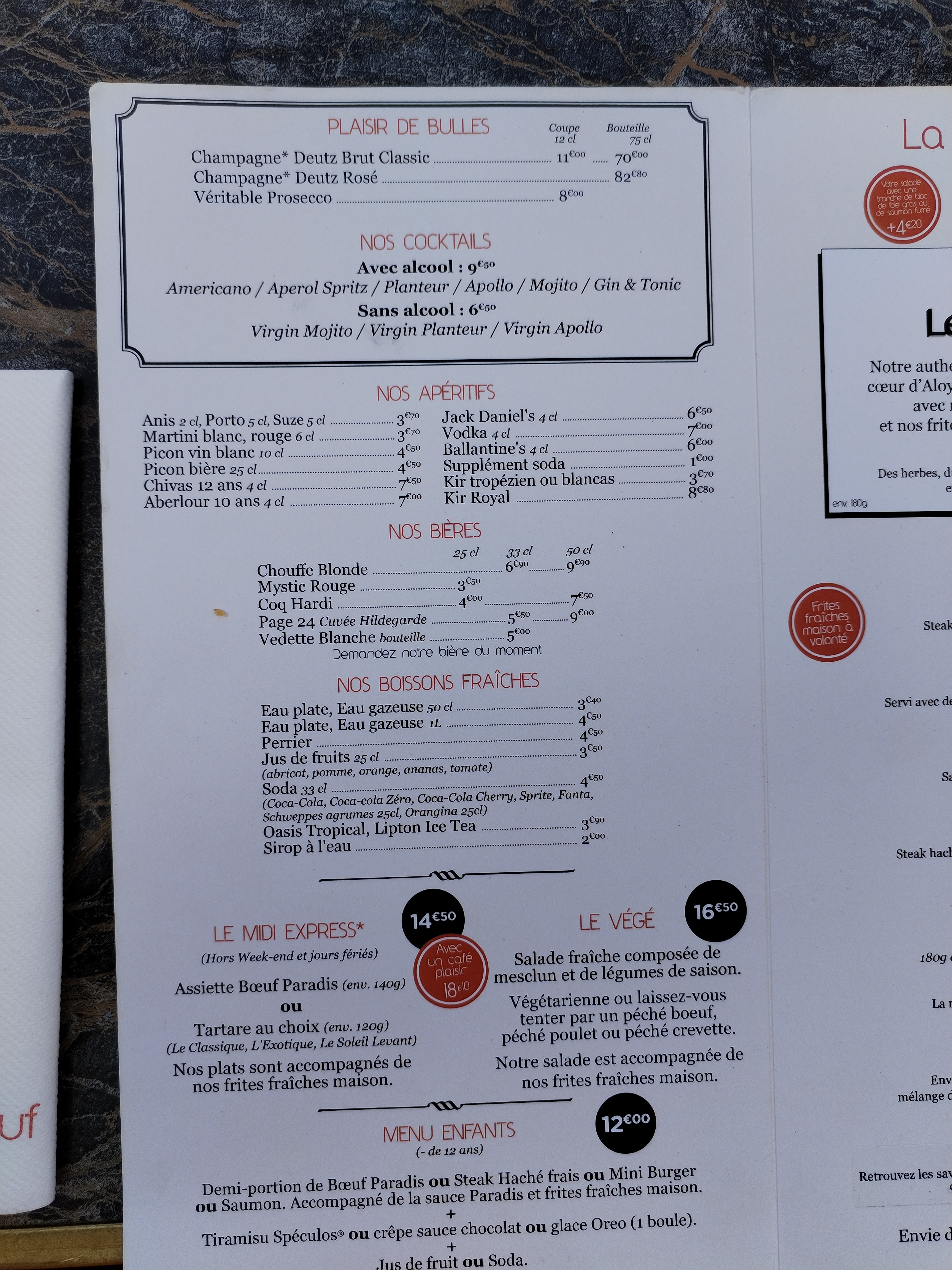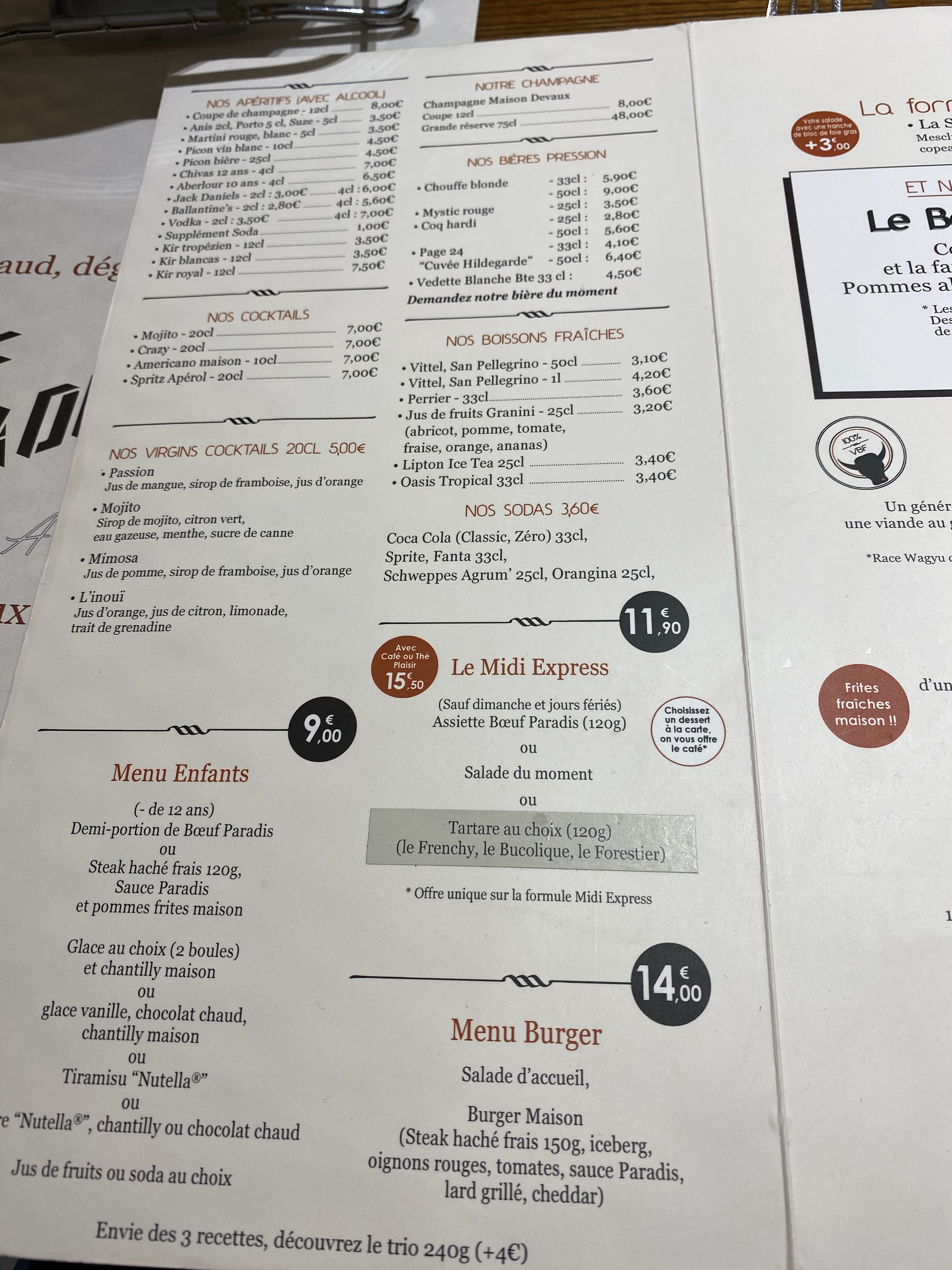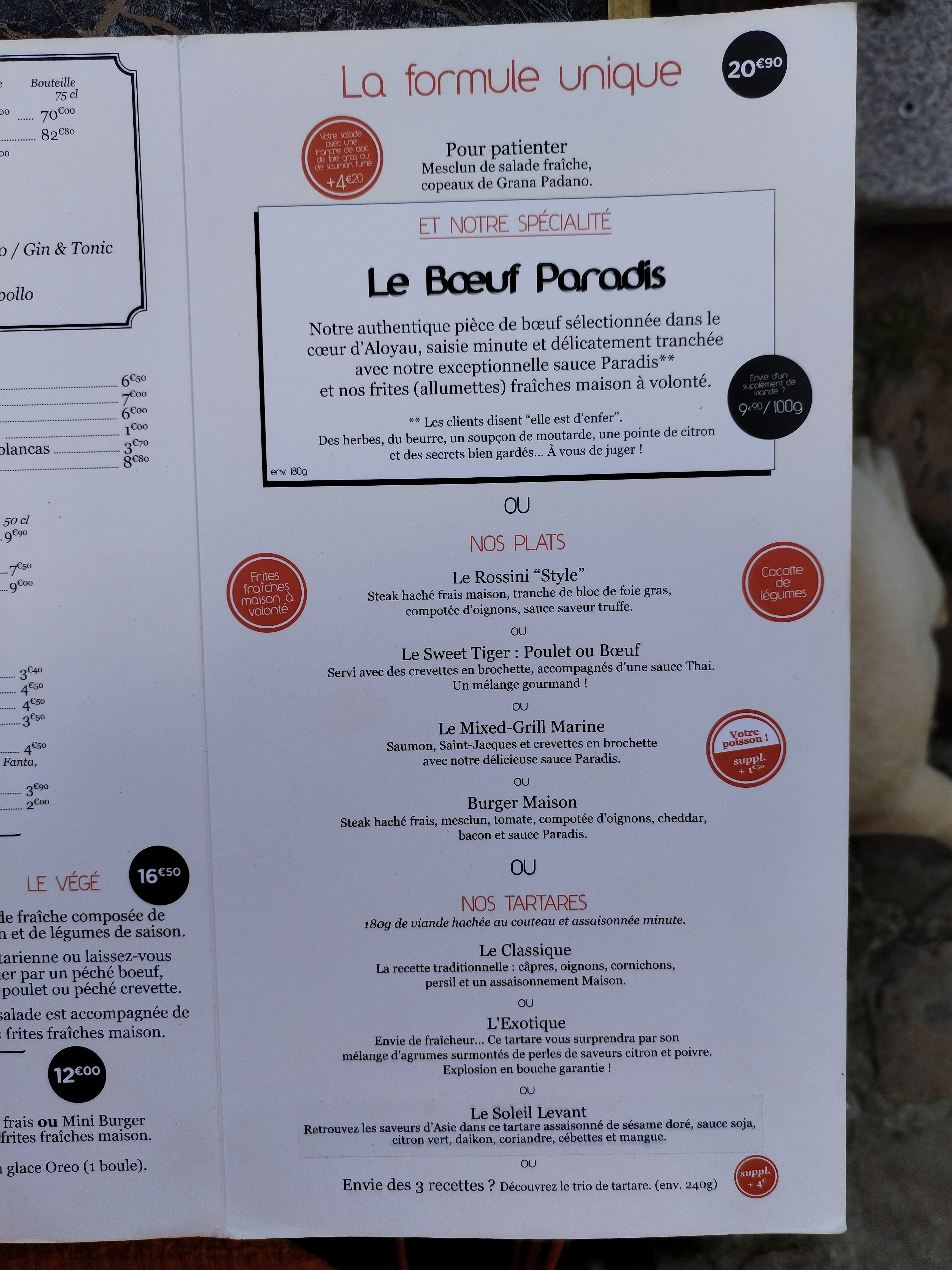 Un choix de menu varié mais surtout concentré sur la viande de bœuf. C’est au moins la 15ème fois que j’y vais est pourtant je n’est jamais change de menu, « Bœuf Paradis » de la viande tendre🥩, délicieuse avec une sauce des plus succulente🤤 et des frites🍟 croustillantes as l’extérieur qui sont à volonté. Des desserts🍨 très bien garnis. Un personnel très accueillant et sympathique💖, avec leur nouvelle décoration depuis fin novembre le restaurant est splendide. Je recommande fortement👌 mais surtout il faut réservé sous peine de ne pas avoir de place.😱
