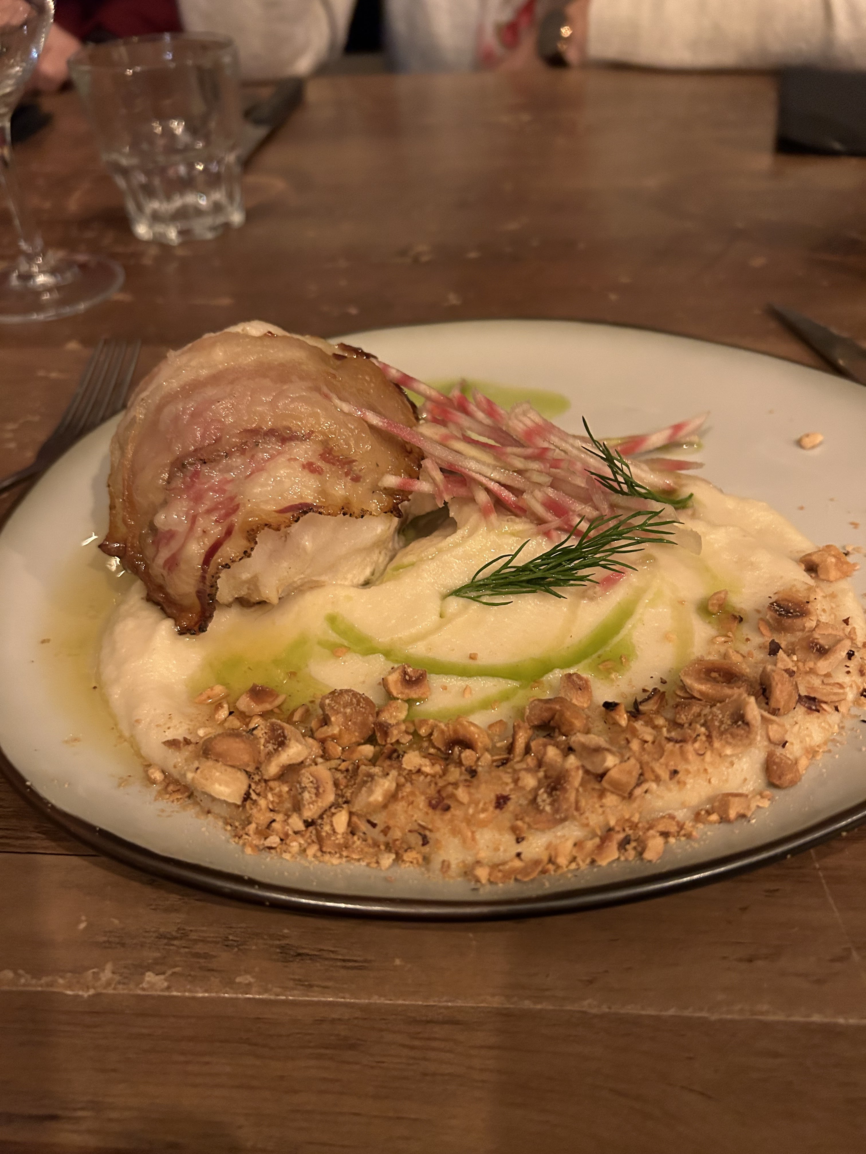 C'est un bistro très mignon. Il dispose de deux salles à manger et d'une grande terrasse. Il y a des étagères remplies de bouteilles de vin, classées selon les appellations d'origine. Nous avons dégusté des poireaux vinaigrette, des gnochis aux champignons, très savoureux. En plat principal, des longes de lotte, accompagnées de guanciale et d'une délicieuse sauce aux noisettes.