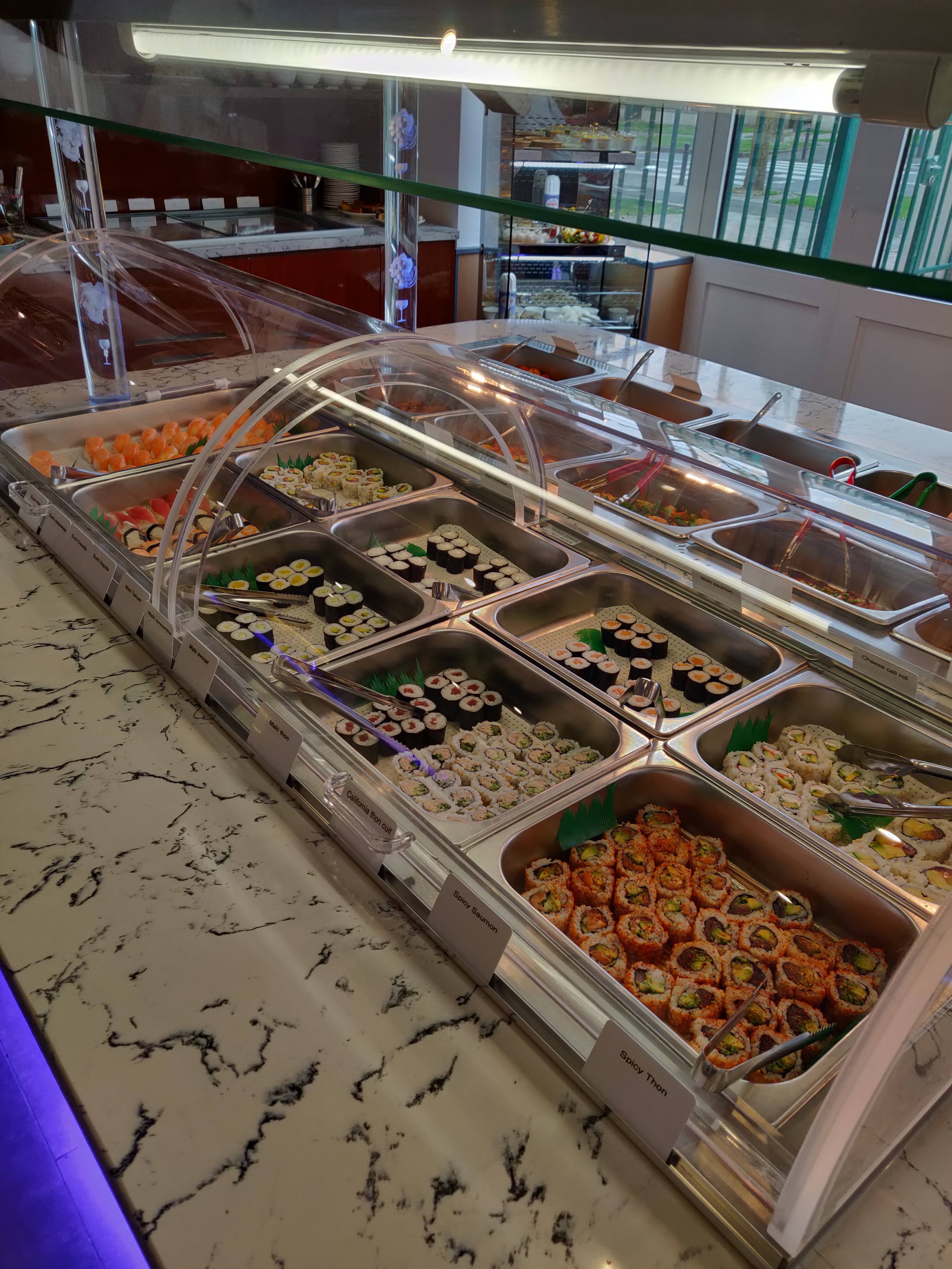 Les sushis et makis sont délicieux, il y a des variétés de sushis qu’on ne retrouve pas dans les autres restaurants asiatiques à volonté, la femme qui encaisse est très sociable et accueillante. J’ai enlevé une étoile car j’étais déçue par les desserts, je trouve que le buffet des desserts est très pauvre, c’est dommage.
