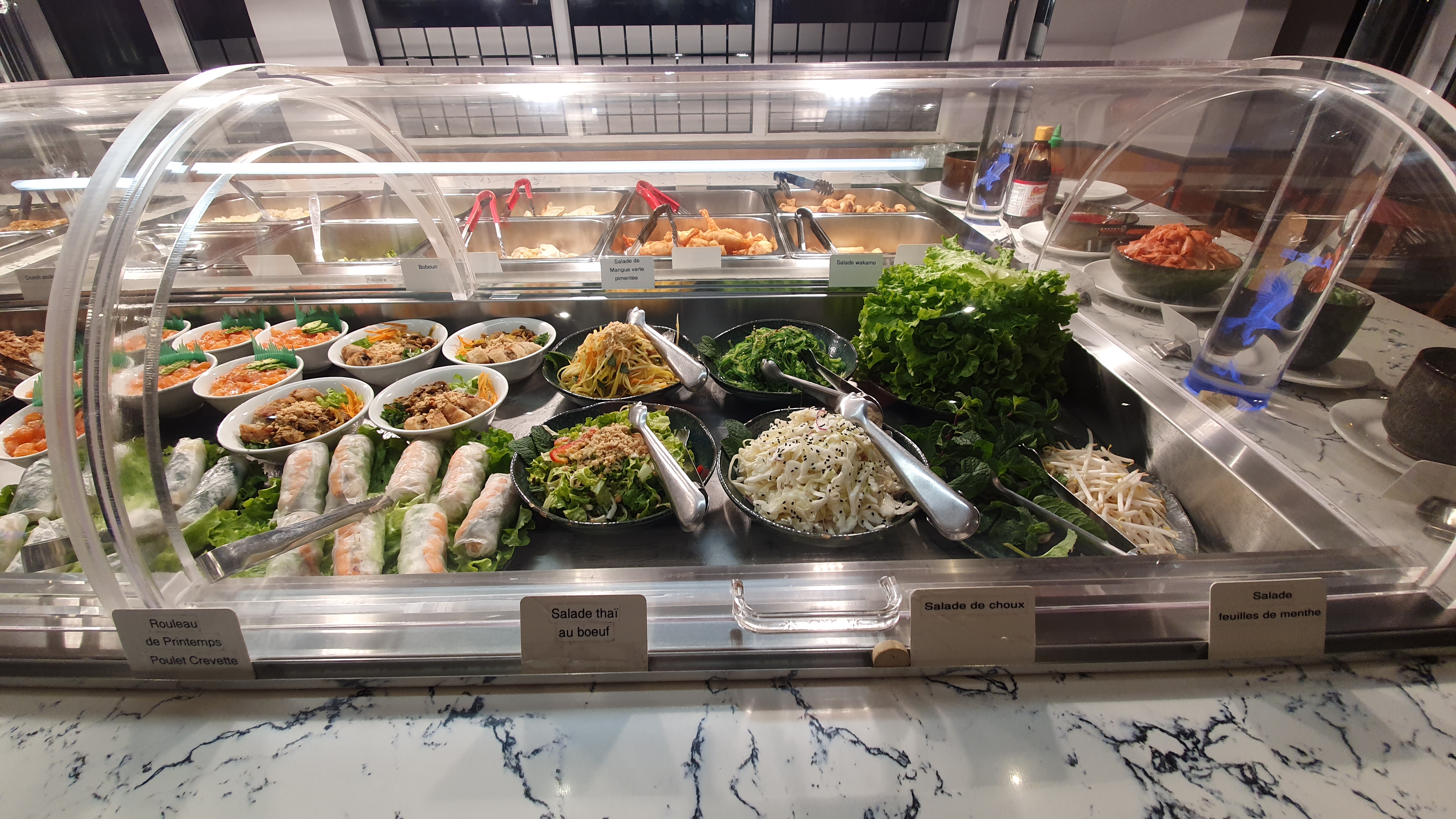 Un délicieux buffet qui propose des mets de qualité et très originaux (par exemple la marmite amok de poisson au coco qui était délicieuse!), large choix de sushi/maki bien réalisés (gros coup de coeur pour le crispy california maki au saumon!) Et les desserts à base de verrine sont extra également. Un régal du début à la fin!
