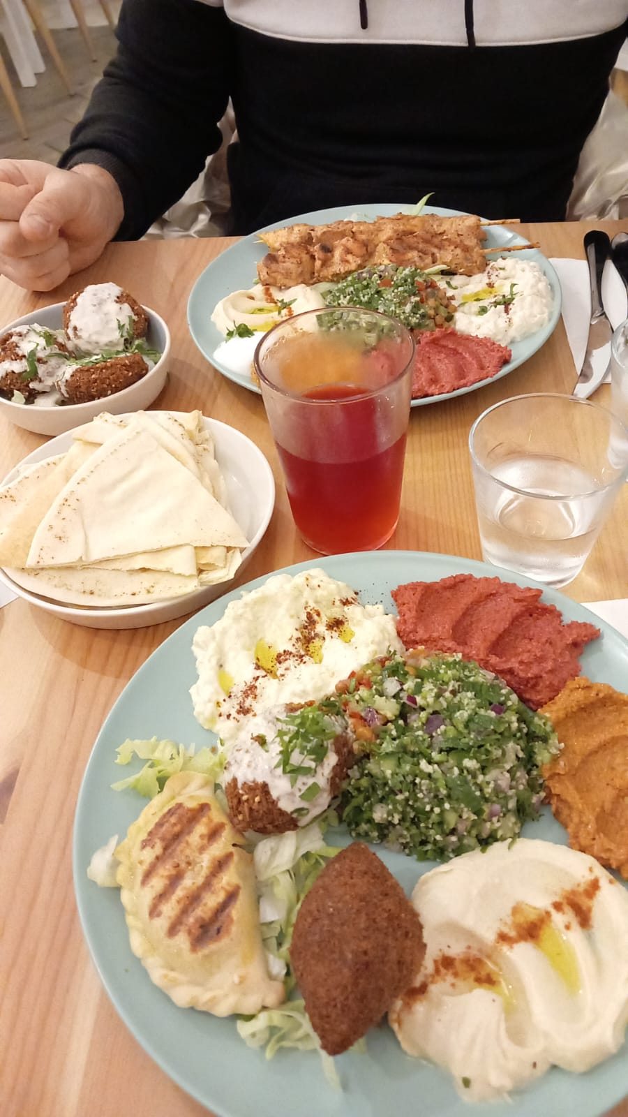 Nous avons pris l'assiette mezze et l'assiette brochette, c'était succulent, le taboulé libanais excellent. Pour les pâtisseries, le baklava était très bien, je n'ai pas trop aimé les autres pièces pour 4€, la portion avait un goût de reviens-y 🤗