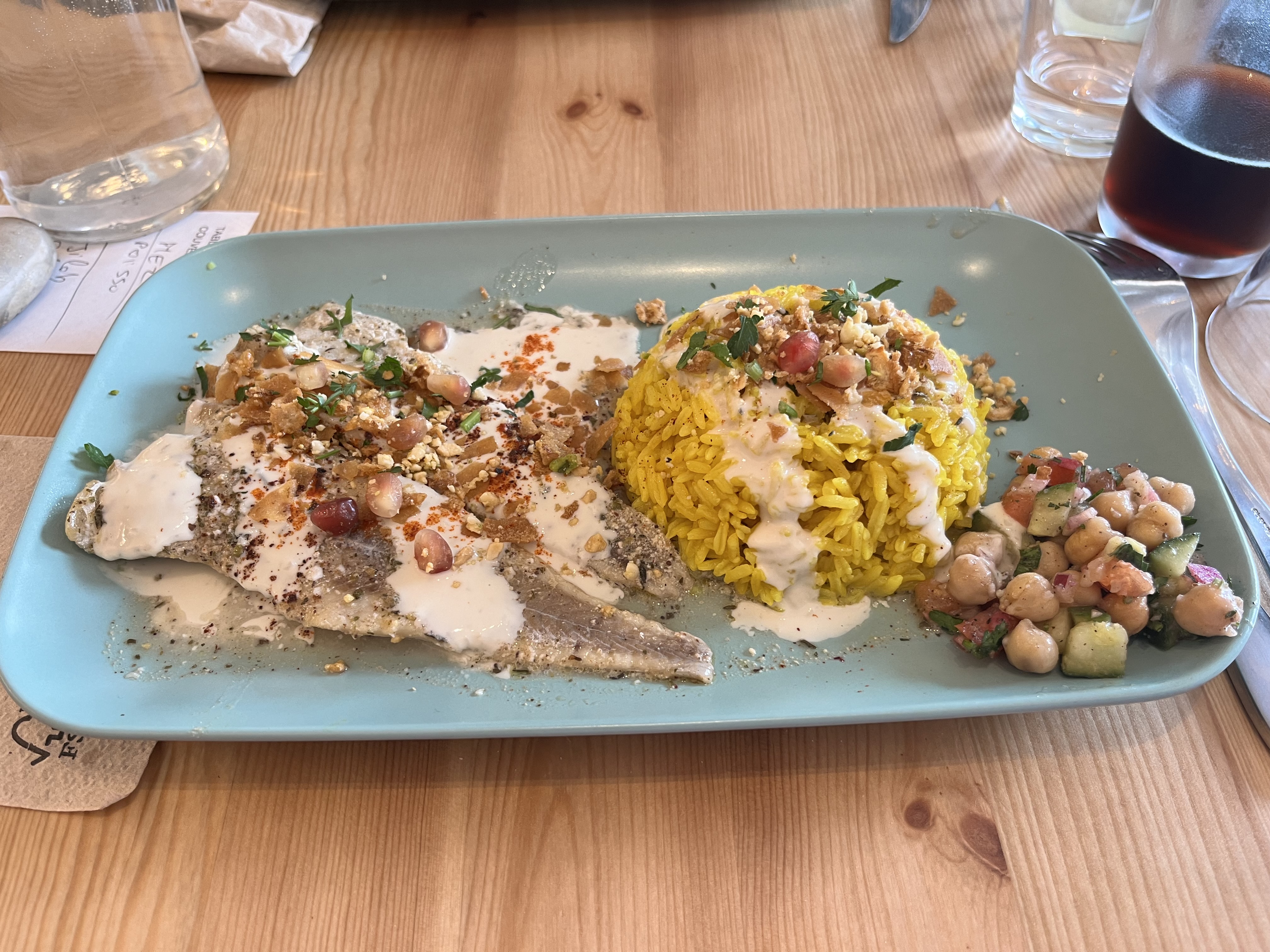 Je remercie le hasard qui nous a conduites ds ce restaurant. Un régal avec le plat du jour = filet de poisson/riz/petite salade. Très équilibré. Un bouquet d'épices pas agressif. Le taboulé vert est délicieux. Le mahamora (purée de poivrons), idem. Le service est adorable et efficace. La salle est joliment décorée d'une fresque aux couleurs solaires avec des tonalités de jaune, orangé et vert. Belle expérience. À renouveler