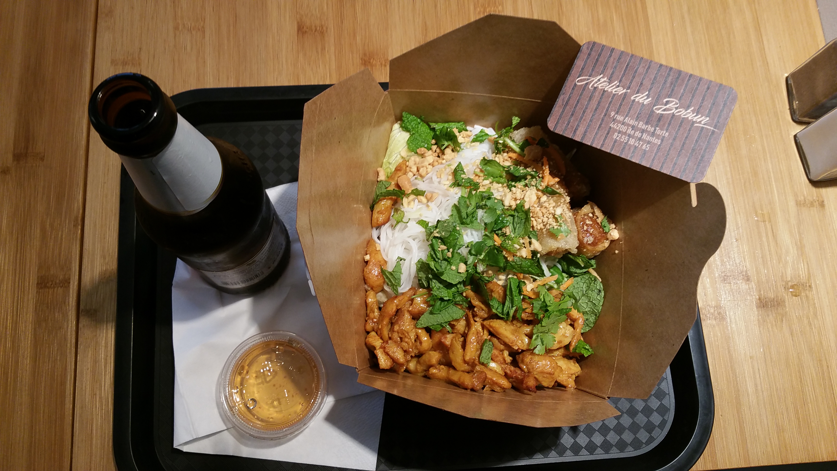 De passage à Nantes, j'ai pris un bobun boeuf à emporter et c'était très bon ! Idem pour le gâteau vert qui n'était pas trop sucré donc parfait ! Il y avait du monde pour les commandes à emporter mais le service était rapide. Je reviendrai !