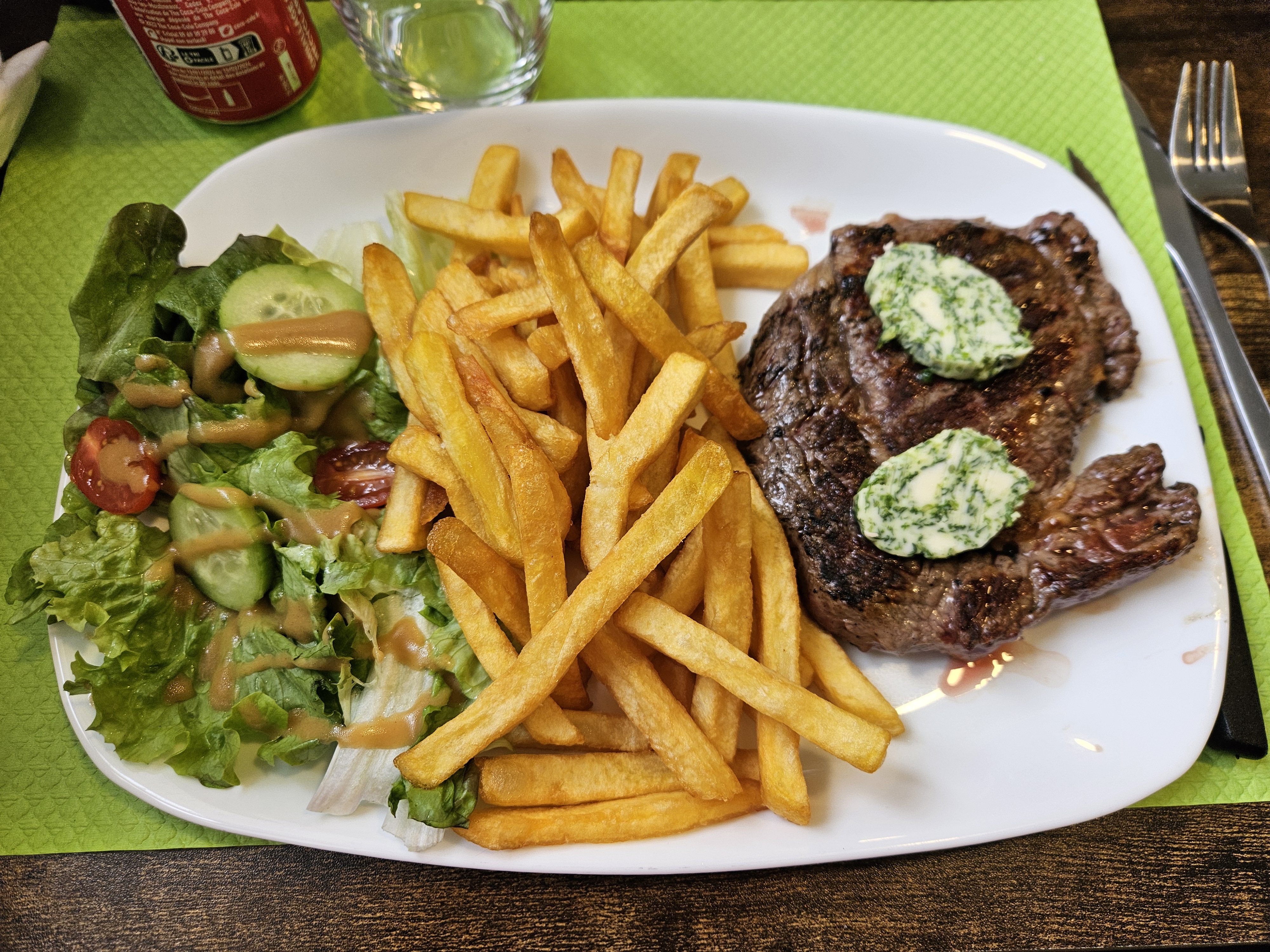 Arriver a 19h45 terminé repas 22h30 très très long salade chèvre munster chaud très déçu pour 12eu très simple charwaman de bœuf 14 eu la pareil vraiment pas top la côte de bœuf pas mal déçu service très long mais serveuse sympathique .déçu