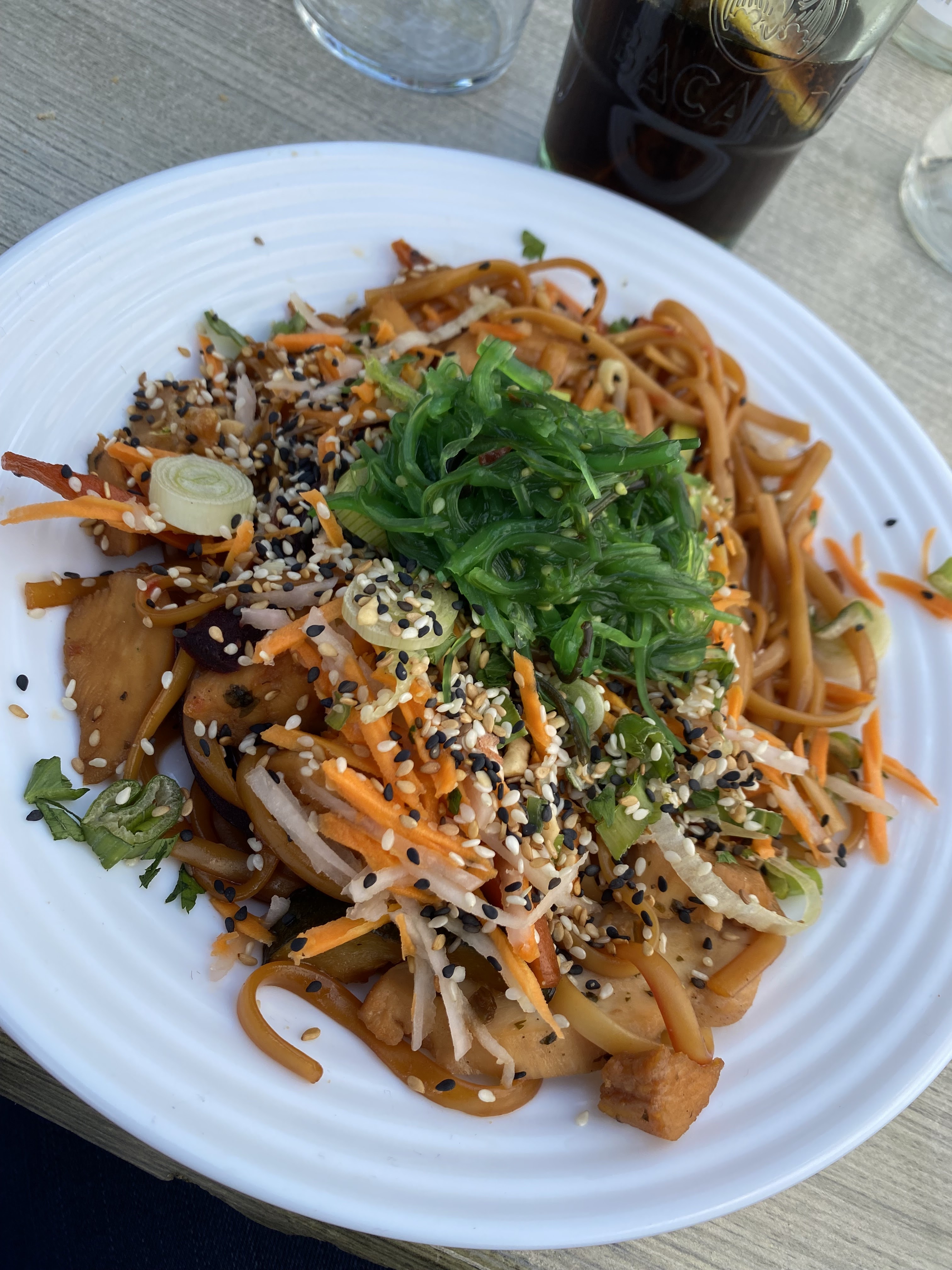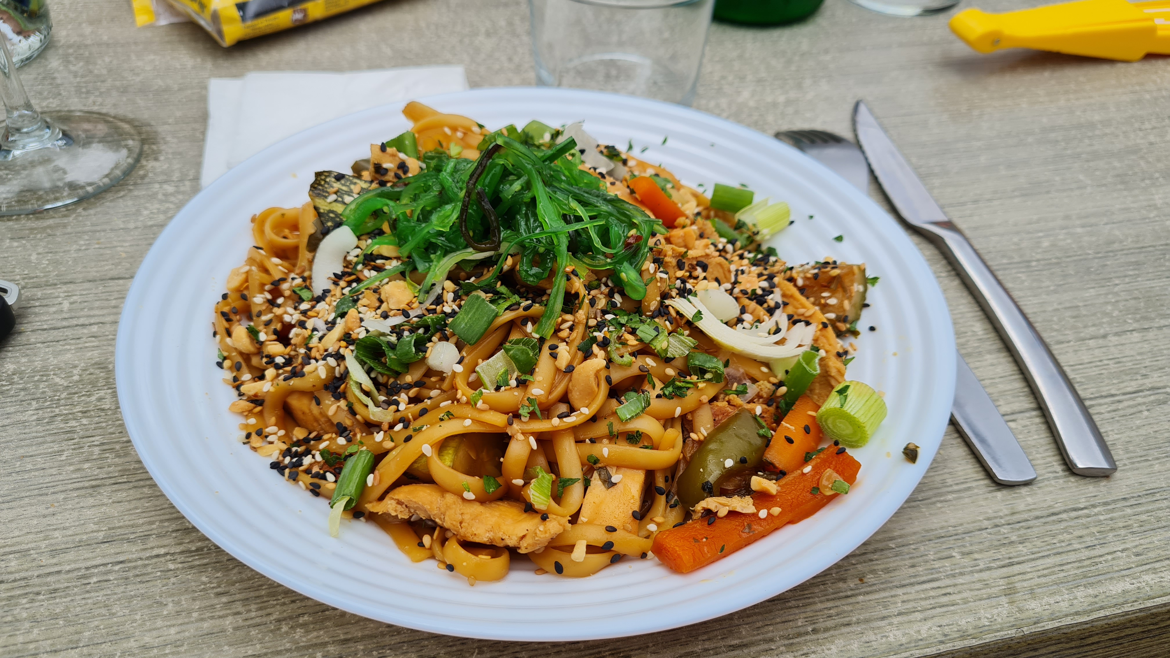 Dommage de présenter une nouvelle carte avec des plats non disponibles. Menu entrée / plat : 27.90 euros Pour la salade japonaise : quelques miettes de poisson au fond de l'assiette ne sont pas filet de lieu comme noté dans la description du menu. Wok de poulet : très moyen avec des cubes de poulet apparence industriel, pas de gout de poulet. La salade et la sauce ne peuvent pas tout faire. Service normal, sans plus.