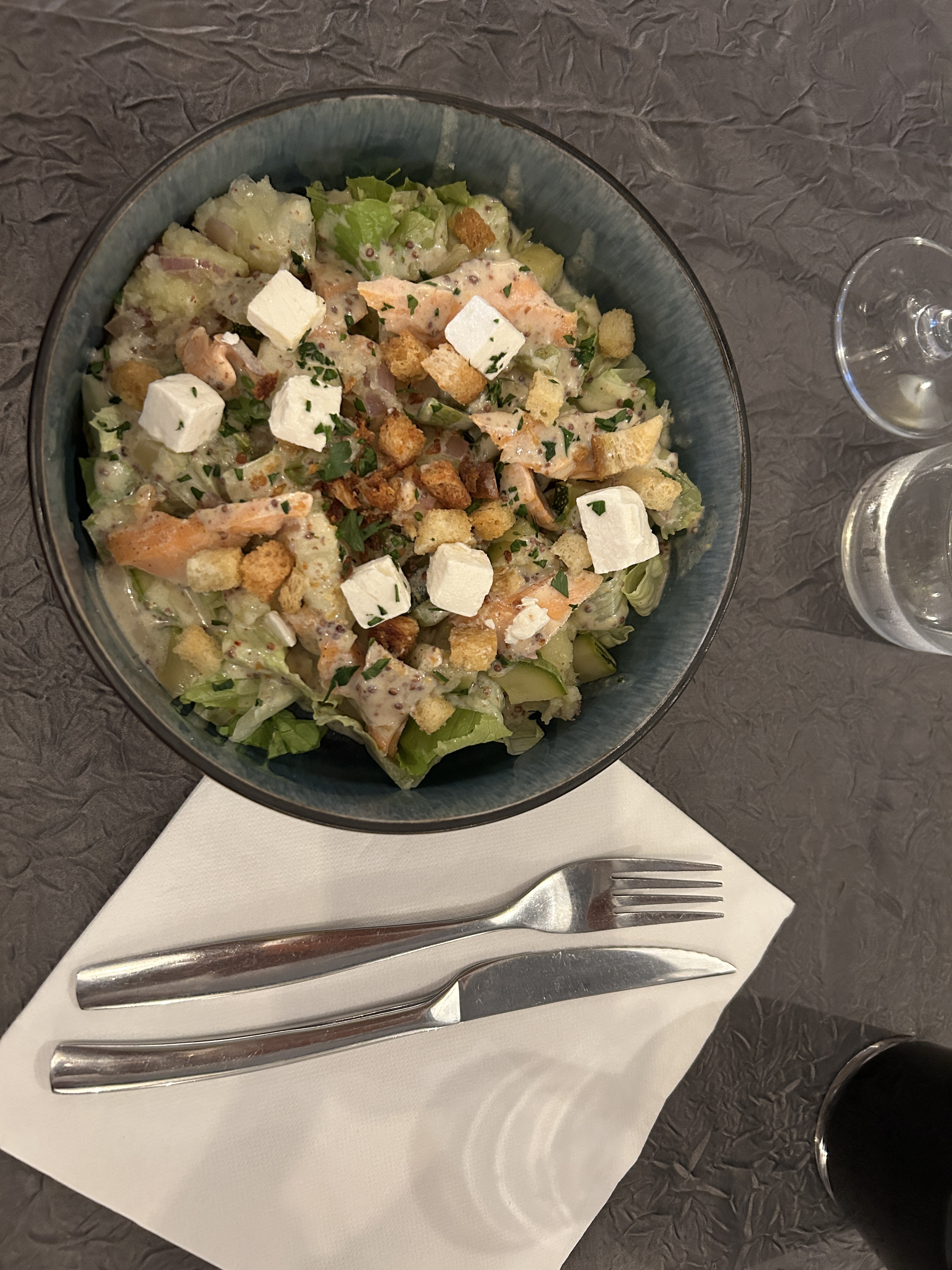 Un excellent restaurant. Je vous le recommande. Le personnel hyper gentil. Ma femme à pris une salade asiatique, un régal. Des produits frais. Un assainissement parfait. Du vin servit à la bouteille Allez y les yeux fermés