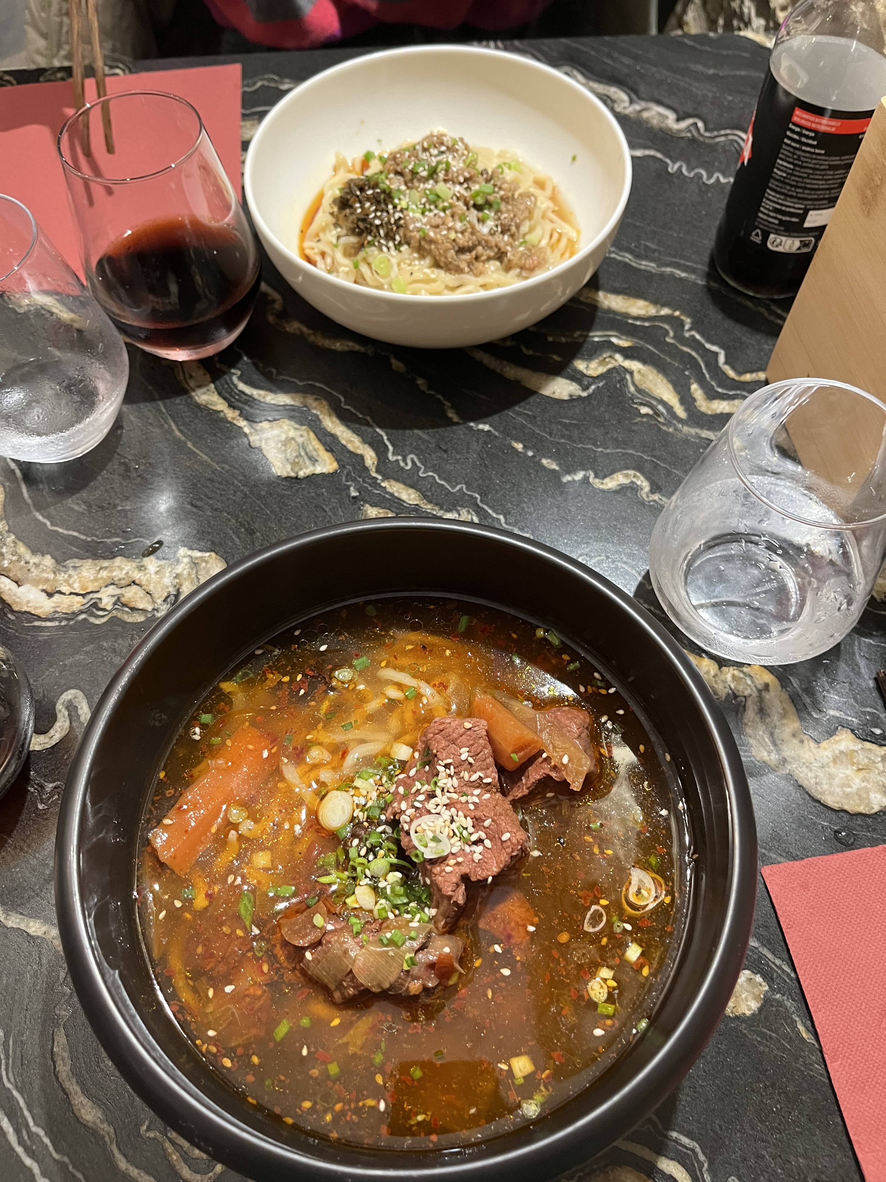 Une merveille! Des saveurs succulentes, que du frais. Nous avons partagé les ravioles, la salade de champignons noirs et le Tofu Pi en entrée, du croquant, de la saveur. Et en plat un suan cai mi xian de porc un régal. Accueil sympa. À très vite