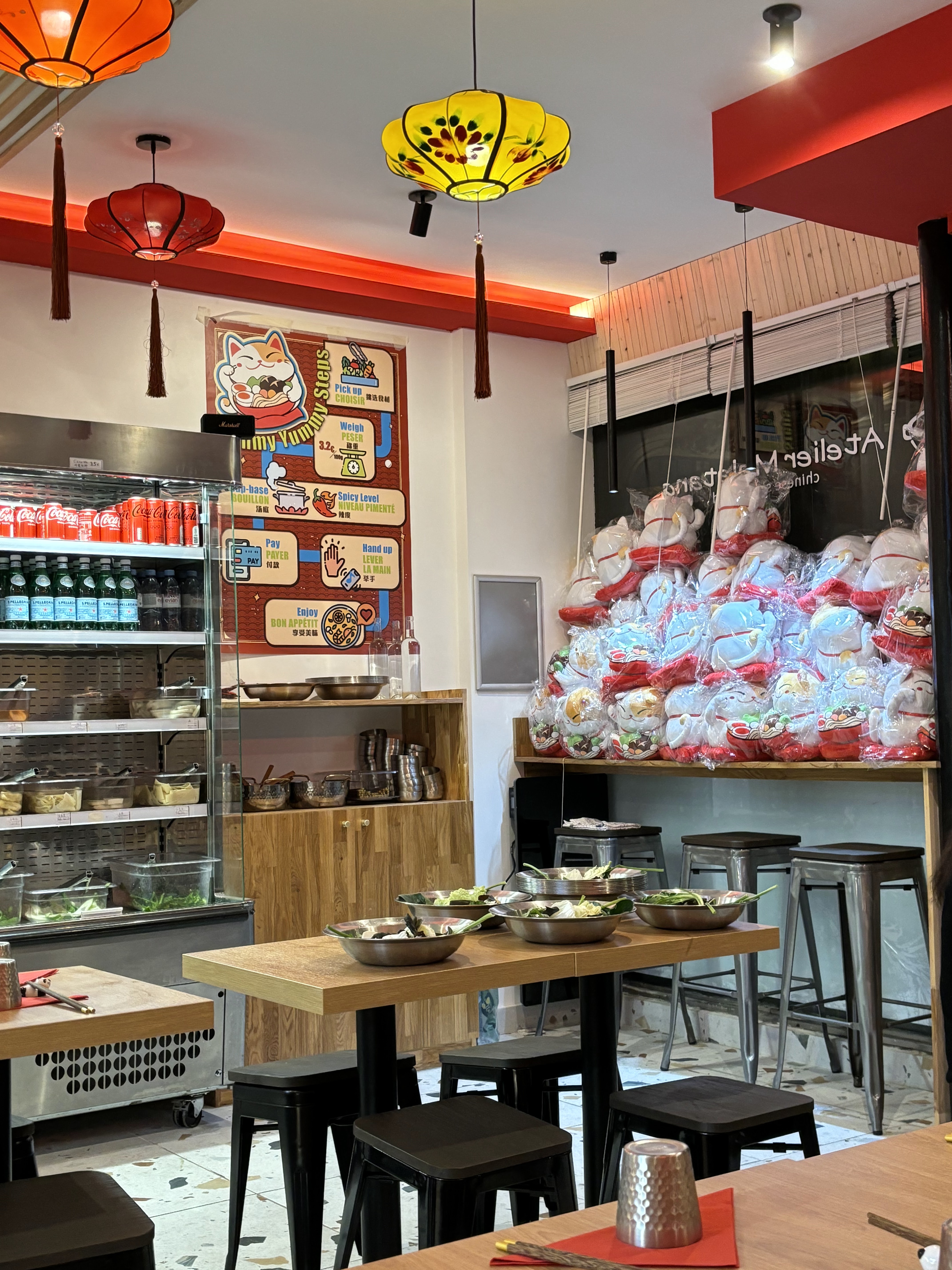 Belle découverte, bien décoré avec une bonne ambiance chaleureuse. On y est très bien accueilli avec le sourire par le personnel qui reste présent pour nous guider et nous expliquer sur le fonctionnement du restaurant et sur la tarification. Possibilité de manger sur place,ou à emporter. Des plats du jour sont proposés. Sinon il faut choisir nos ingrédients environ 3,20€/100g (légumes,viandes, fruits de mer, pâtes,…etc) ensuite on passe au choix du bouillon (plusieurs choix pour les bouillons) on pèse et on règle. Personnellement à chaque passage pour moins de 10€ j’arrive à me faire différent bouillon de pâtes avec plusieurs ingrédients. Les plats dans lesquels nous sont servis les bouillons ont un diamètre assez élevé car une fourchette peut s’y glissé à l’intérieur.