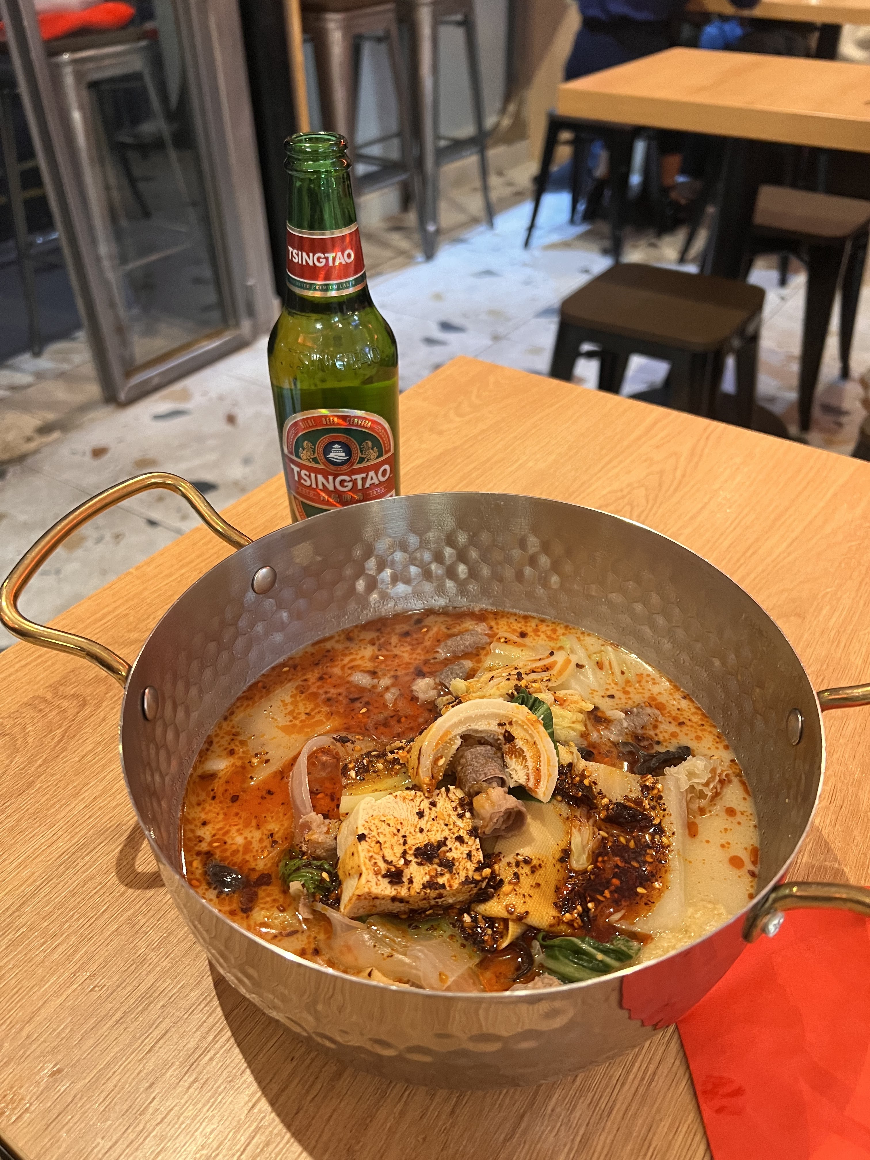 Accueil très chaleureux ! Service rapide. J’ai pris un bouillon Shenyang niveau 1 piment pour 15€50 (petite bassine d’ingrédients qu’on choisit en self) + Bière chinoise qu’on goûte pour la 1ère fois très douce et marie bien le plat. Nous y reviendrons sûrement 😋