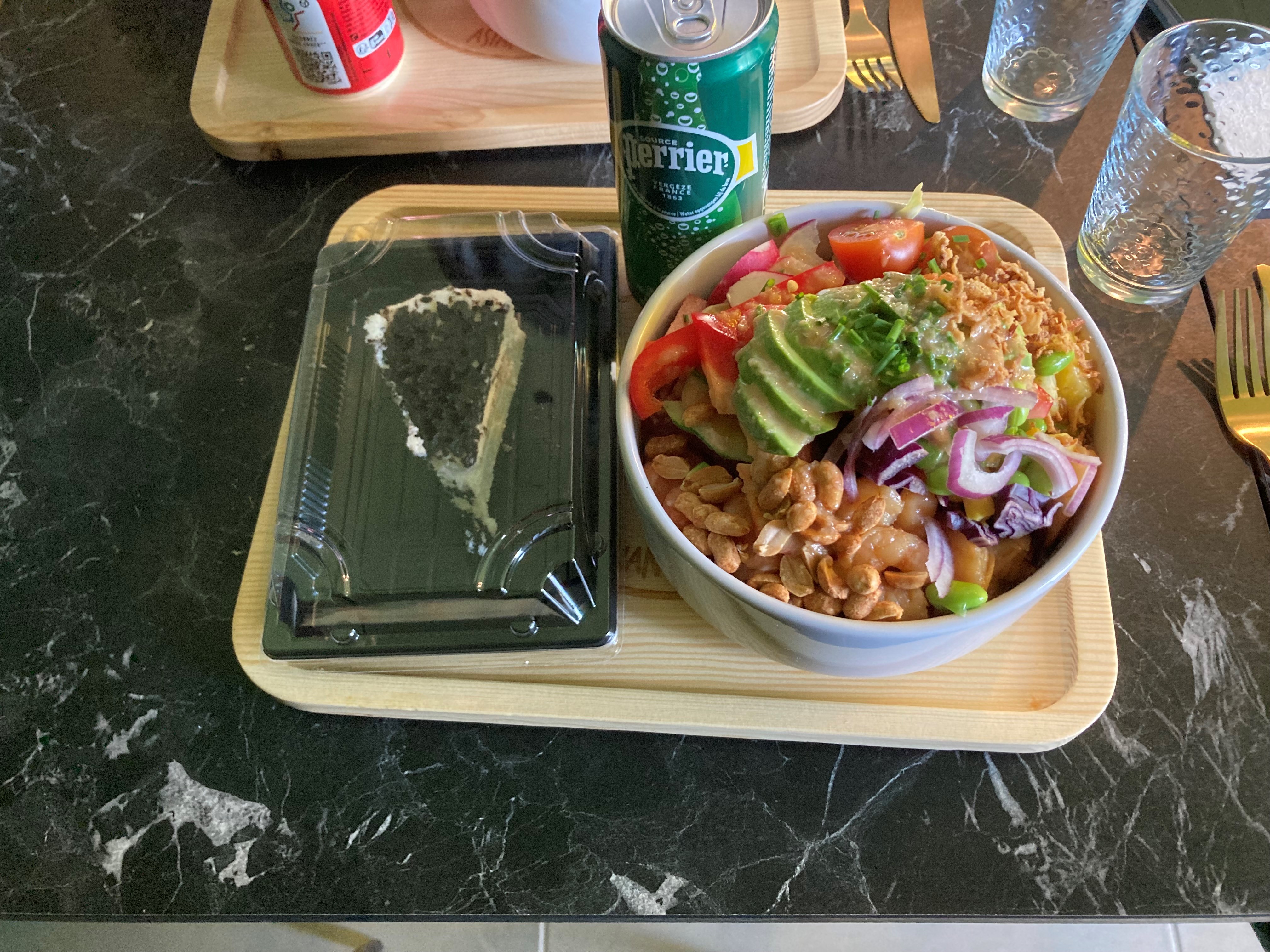 Le lieu est sympa, avec des fauteuils confortables, de la musique et de la belle vaisselle réutilisable. J'ai testé le pokéball au saumon, thon et crevettes marinées, avec du riz, un maximum de légumes, cacahuètes et sauce sésame. Il y avait plein de couleurs dans mon assiette et les quantités étaient généreuses. Seul bémol, le thon était encore un peu congelé, c'est dommage. Le gateau aux Oréos est excellent.