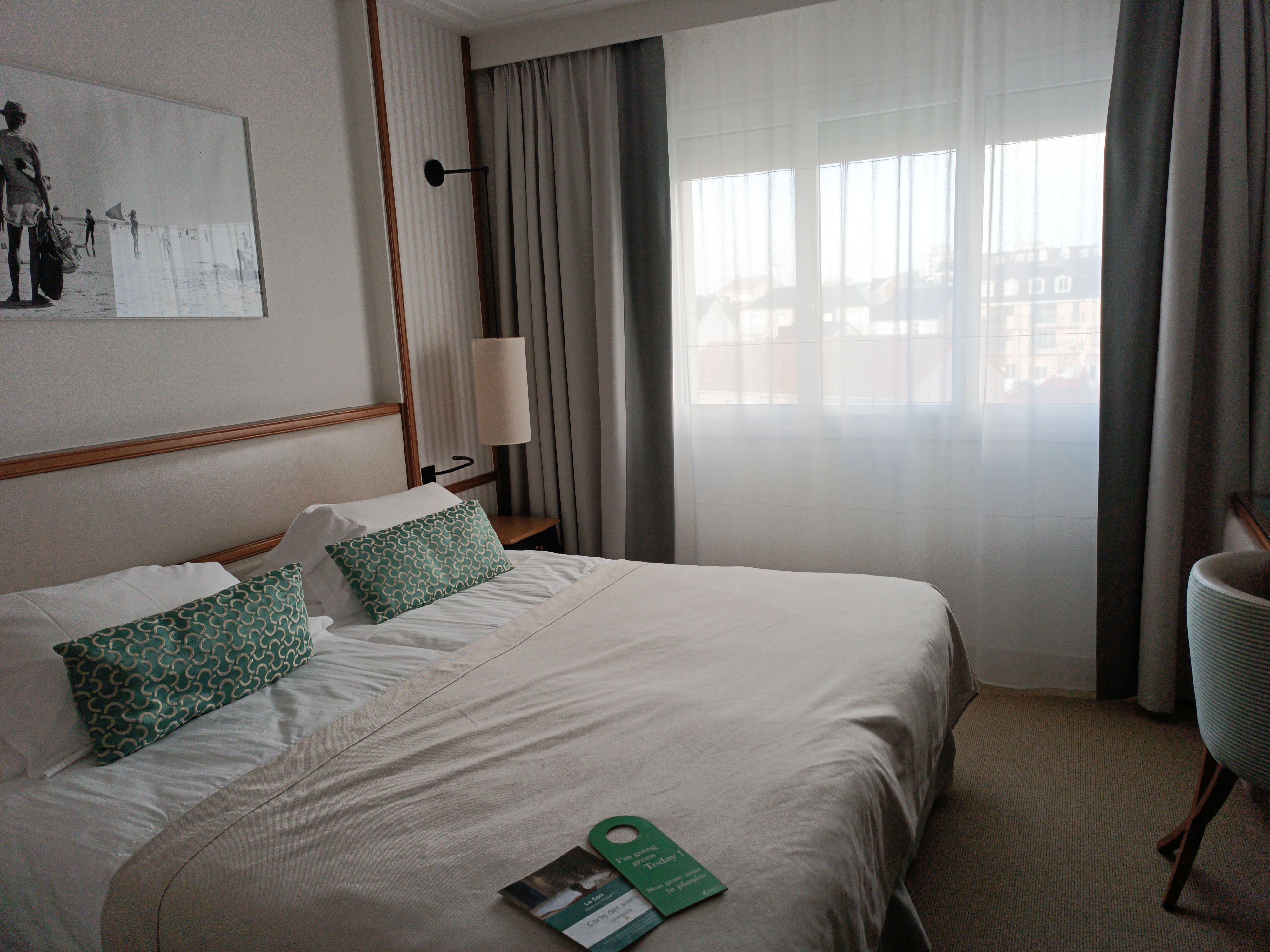Le tarif de la chambre était abordable pour le nombre d'étoiles. On nous avait prévenu qu'elle était petite. Pour une nuit c'était parfait. Très propre et confortable. Café thé à disposition même une petite bouteille d eau, un frigo pour le bar (en supplément). Peignoirs et claquette, coffre fort à dispo. A l'aise dans ma cabine, préservée de tout, j ai dormi comme un bébé. L'hôtel est disposé à quelques pas de la Grande Plage. Il dispose d'un restaurant excellent et d'un institut de beauté qui autorise (si on a du temps) un petit moment à soi.
