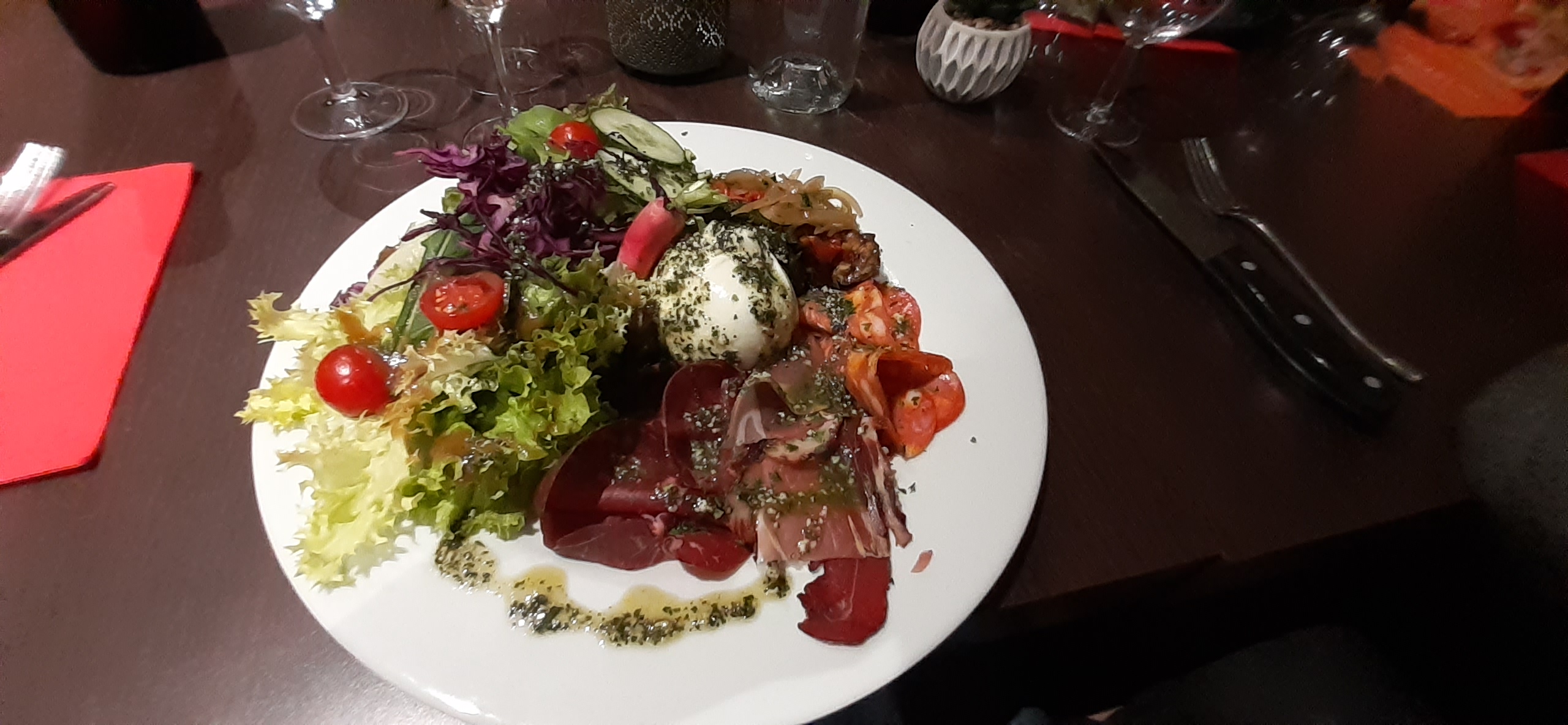 Super soirée ! On était venu en octobre découvrir ce nouveau restaurant italien, hors saison et peu après l'ouverture. Hier soir, manger sur la place, en terrasse, était particulièrement agréable. Mais, au-delà du cadre, on vient avant tout retrouver l'Italie dans notre assiette ! Antipasti faits maison et pizzas au top. La pâte est croustillante et la garniture de très grande qualité. Les desserts ? On ne peut pas vous dire, malheureusement. On avait déjà trop mangé.
