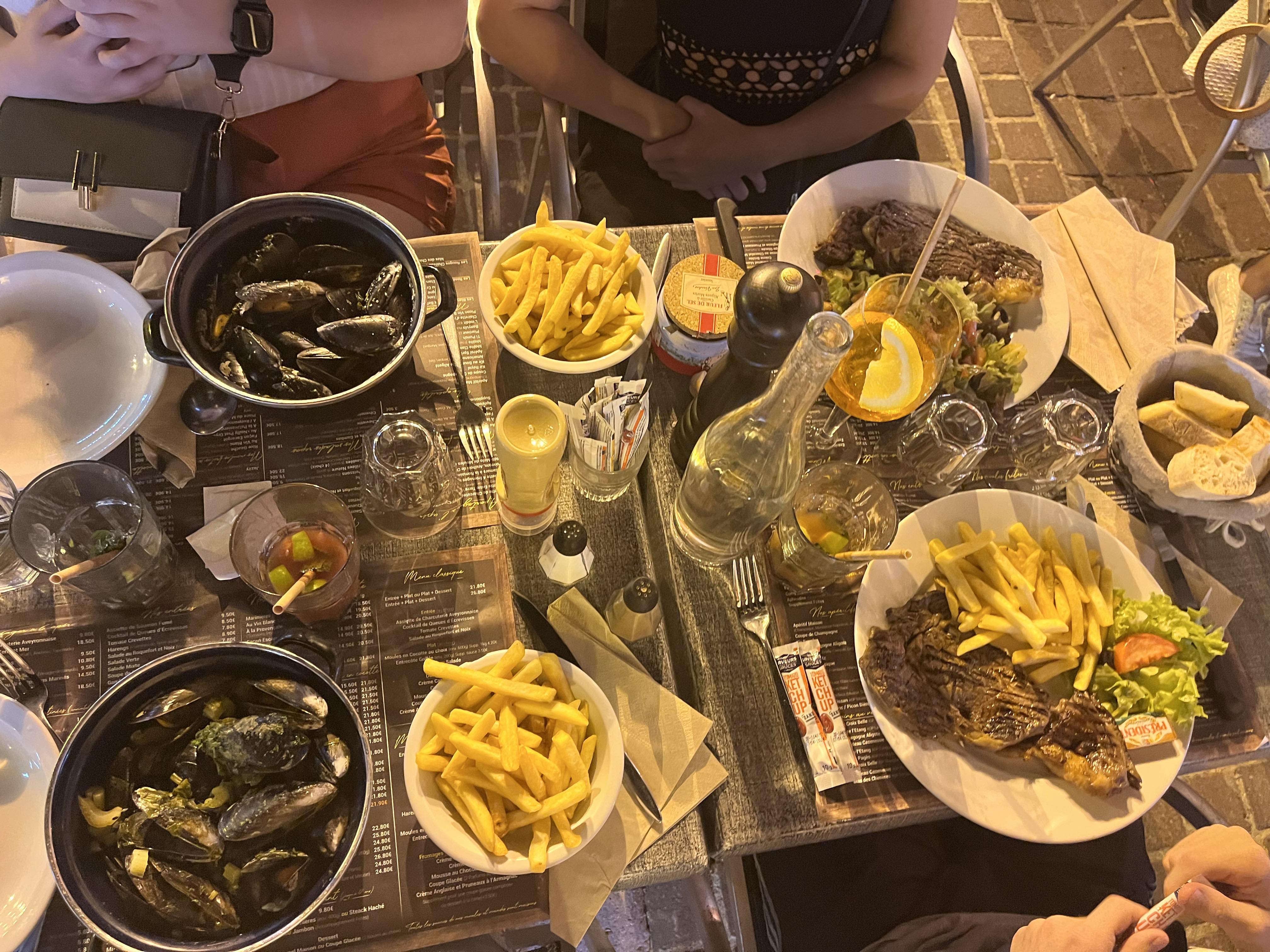 Une paisible soirée de septembre. Température agréable. La jolie petite terrasse située dans une zone piétonne. De délicieuses moules à la crème Aphrodite (gingembre, lait de coco, piment) ou au Maroilles accompagnées de frites croustillantes et arrosées d'un Picpoul bien frais. Autant d'ingrédients pour une soirée en amoureux, simple mais réussie.