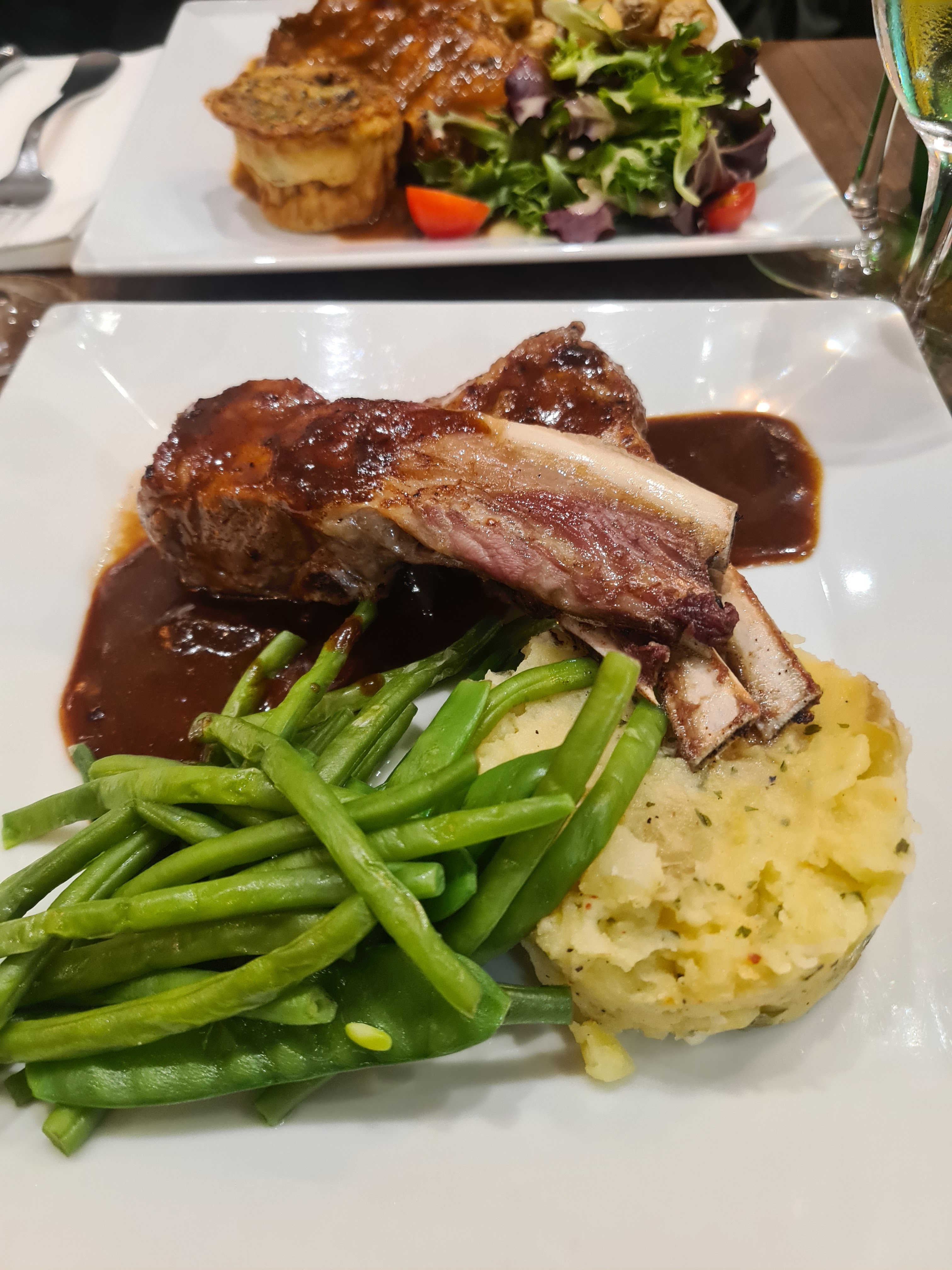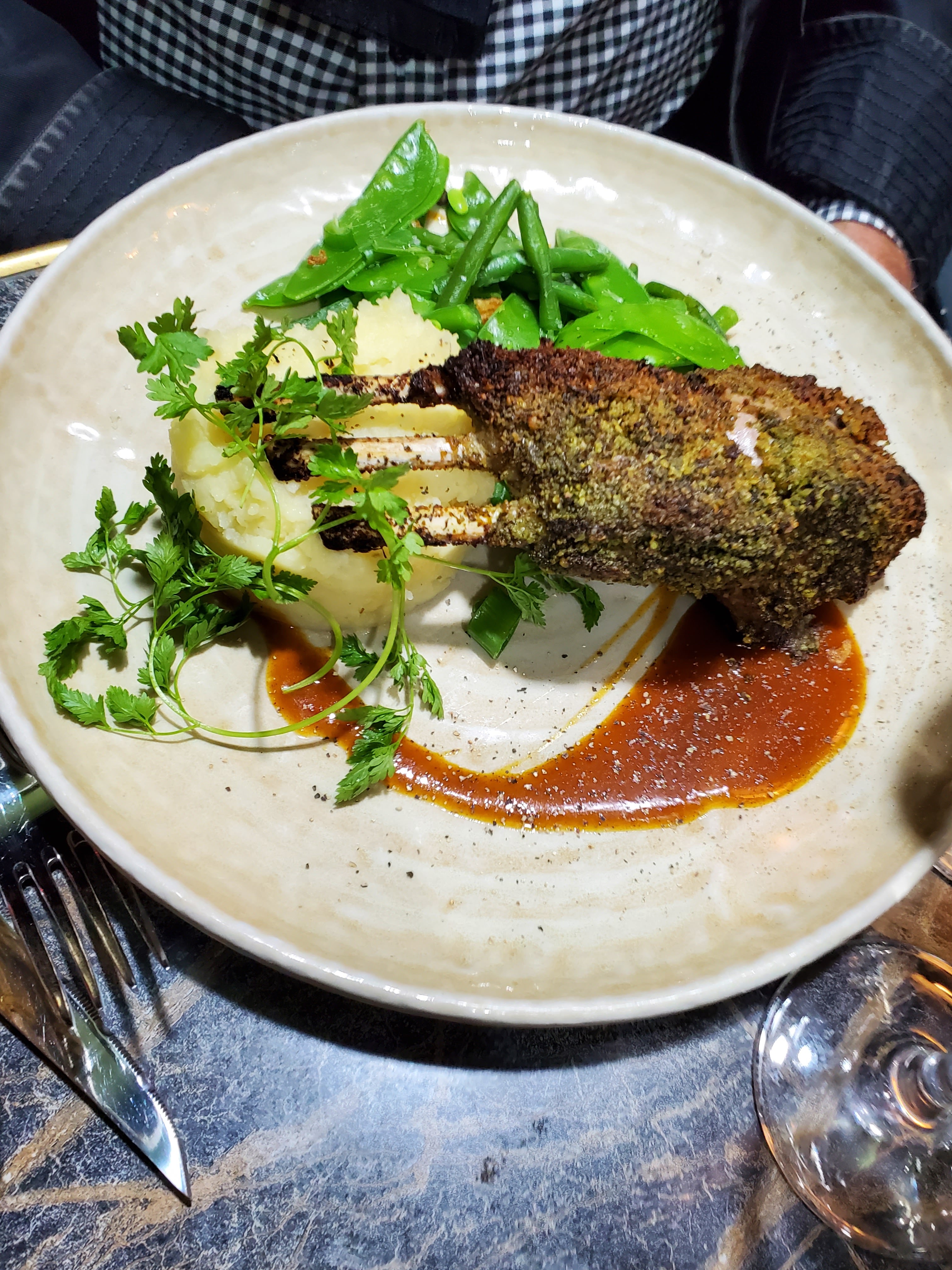 Nous avons dîné en plein air au Au 35 qui se trouve dans une rue résidentielle calme. Notre serveur était très attentionné, aimable et serviable. Il a proposé des suggestions qui ont été très appréciées. Nous avons commencé par une généreuse portion de foie gras savoureux, joliment présenté. J'ai ensuite eu le Chateaubriand, que j'ai beaucoup apprécié, et mon mari a eu le carré d'agneau, incrusté d'un parfait ensemble d'épices. Mon mari m'a demandé une suggestion de vin blanc pour accompagner l'agneau. Un bordeaux blanc a été suggéré, ce qui constituait un accord parfait. Nous reviendrons certainement.