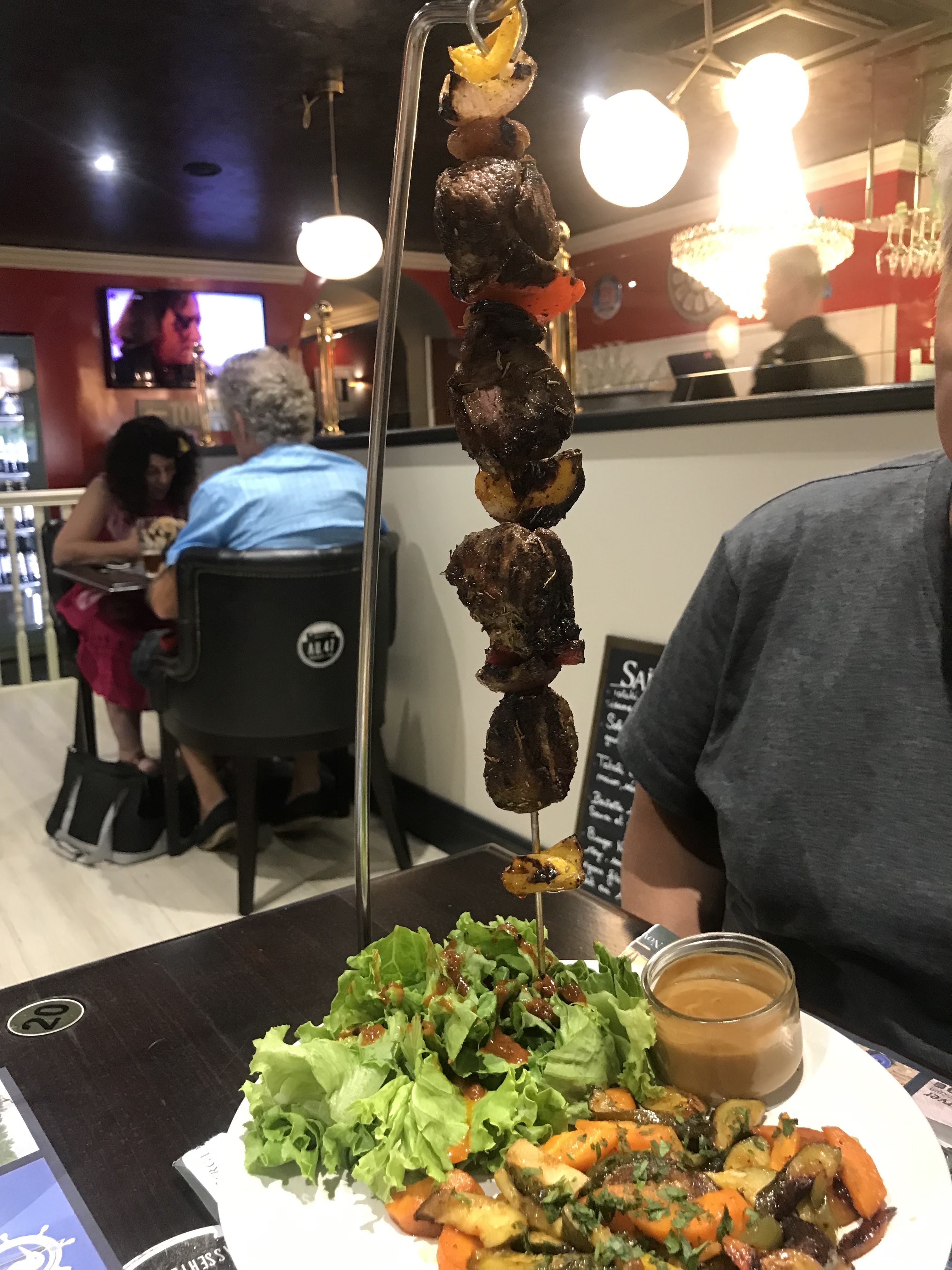Dîner lundi. Attention seul resto brasserie du coin ouvert le lundi soir. Plat brochette d'agneau saignante (spécialité de la maison d'après la serveuse) accompagnée de pommes au four et salade sauce vinaigrette framboise. Bon, parlons sérieusement : viande manquant de maturité donc dur. Difficile de savoir si c'était de l'agneau ou du boeuf car la marinade peut être faite avec du Cahors, masquait le goût de la viande. Sur quelques morceaux on avait légèrement le goût du thym et du miel. Je me demande si il n' y avait pas un mix de deux viandes. Les pommes de terre étaient bonnes. C'est la berizina : c'est le 2e resto d affilé que je fais dans lequel je ne reviendrai pas...
