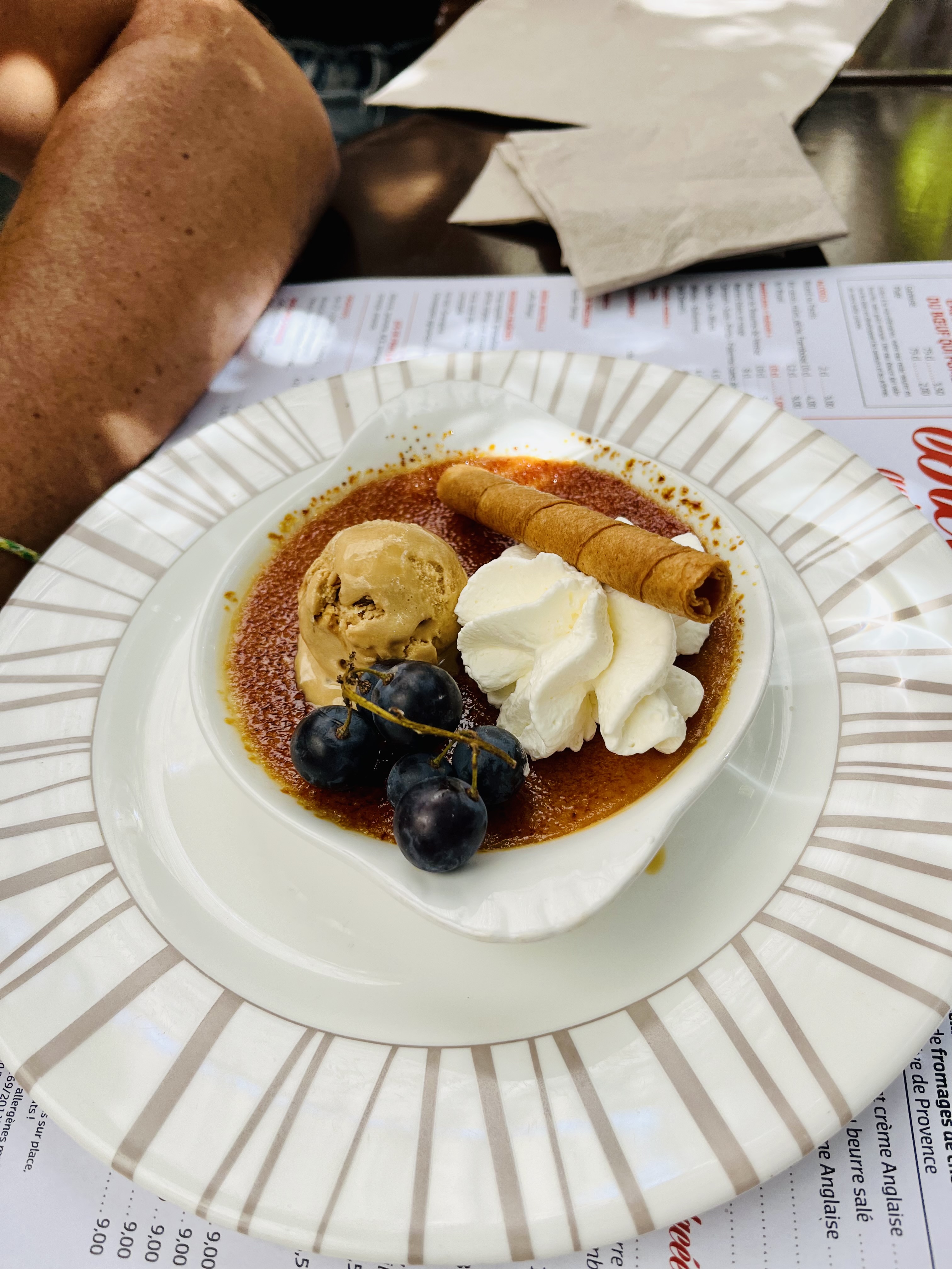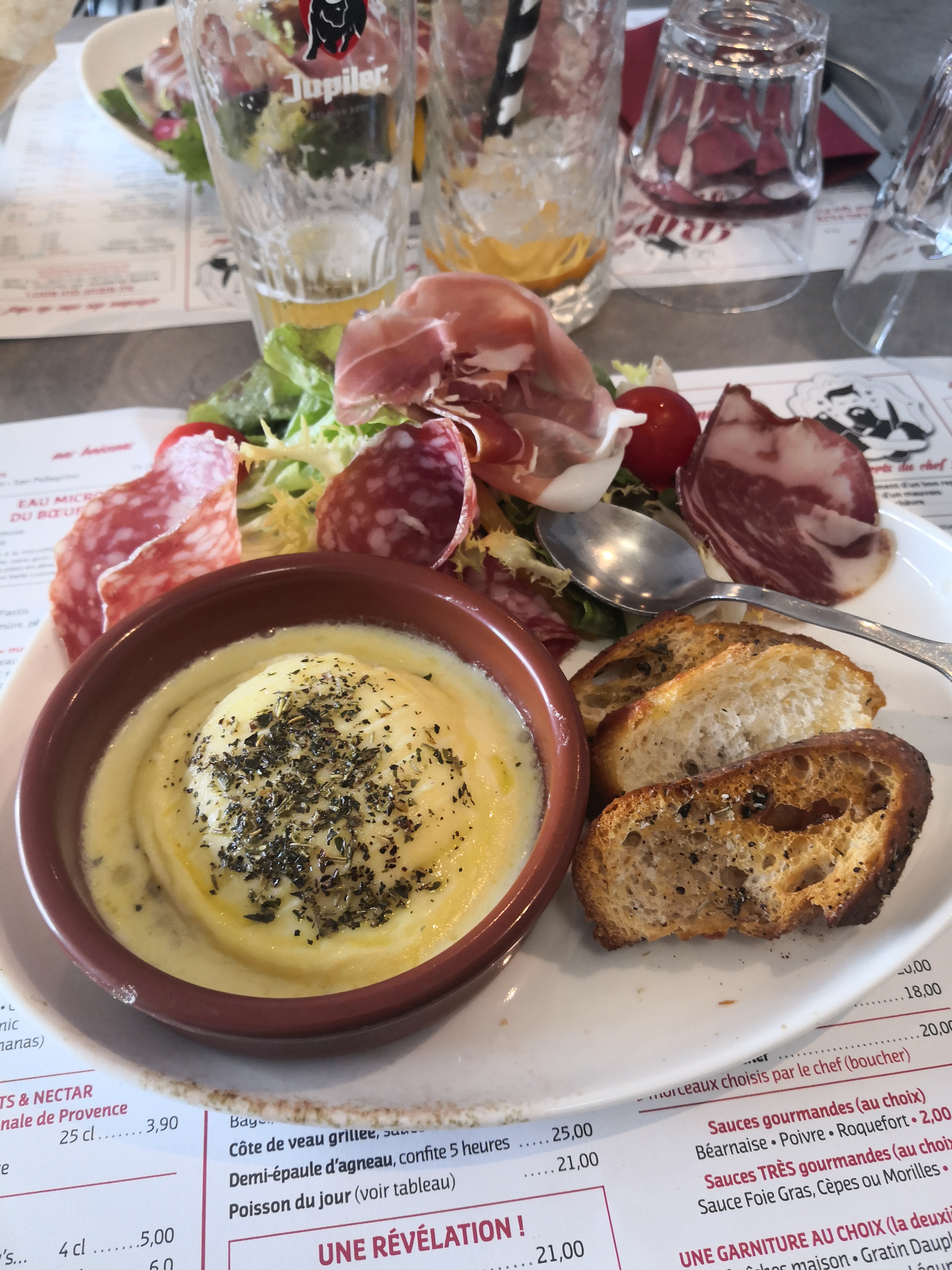 Soupe d'oignon tres bon. Viande tres bon et creme brulee