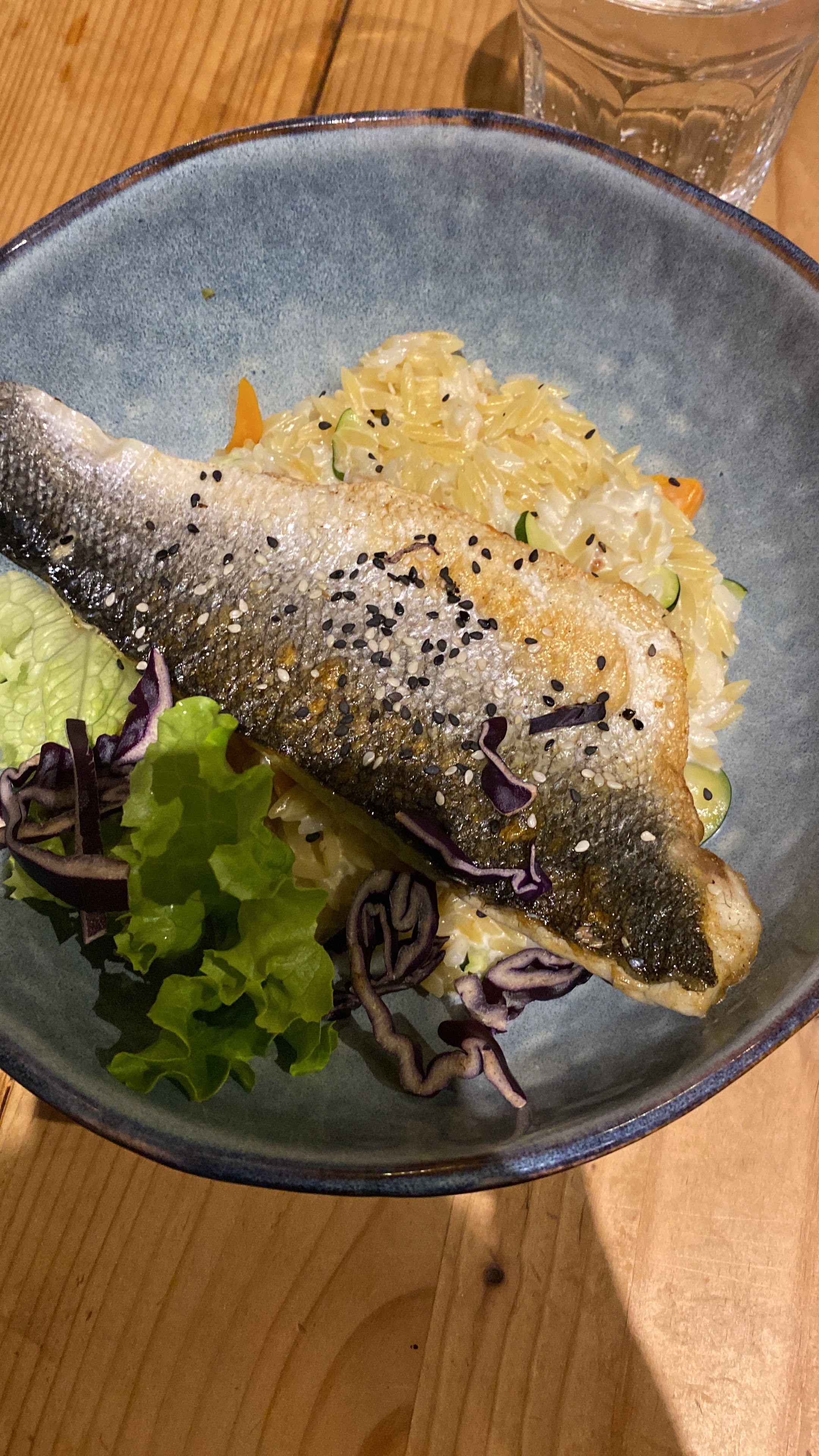 Un poisson sur lit de risotto à tomber !! Service agréable efficace Le pinot local excellent Je recommande !