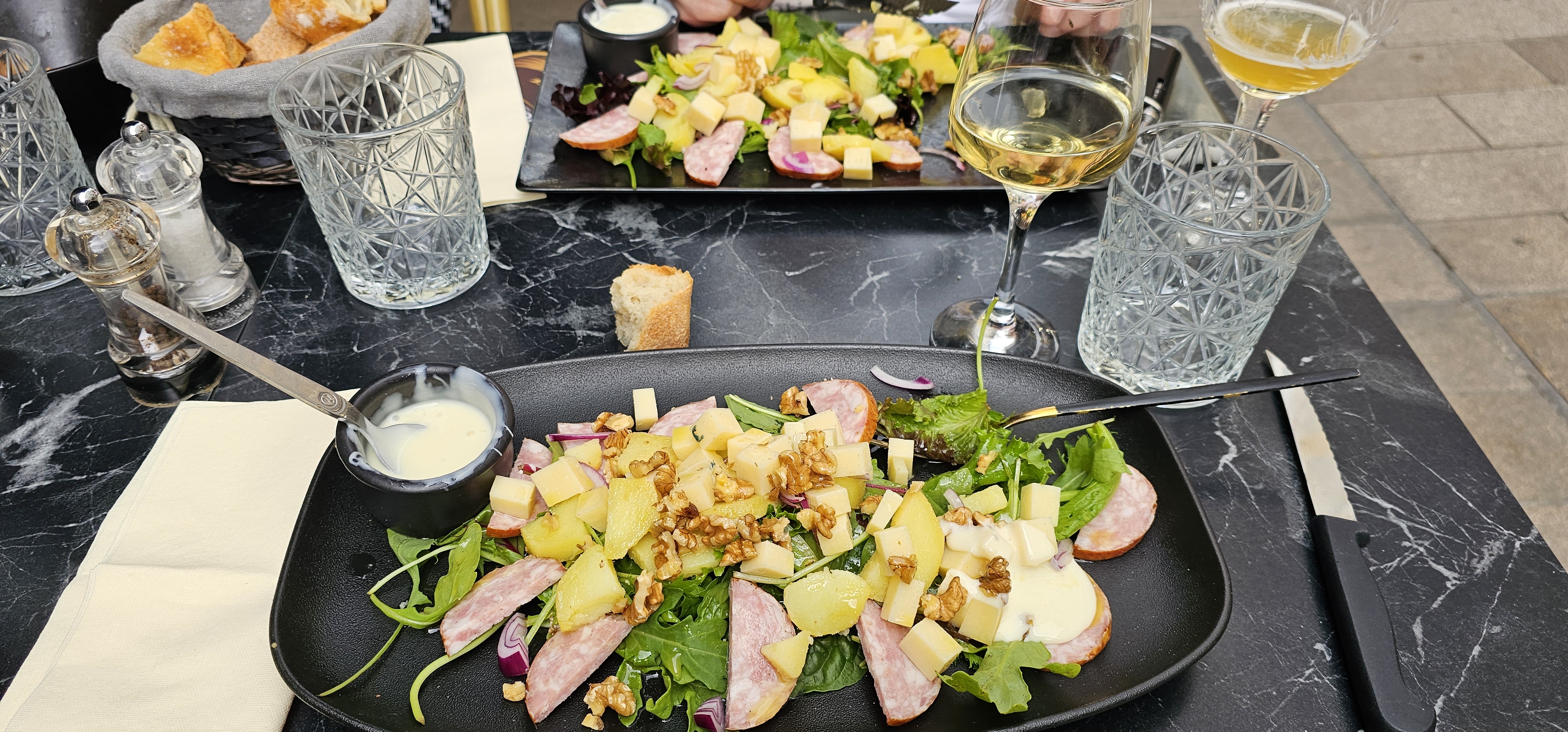 Une salade franc-comtoise très bonne, ni trop ni pas assez. Le personnel est très sympathique, que ce soit la serveuse ou le cuisinier qui est aussi très présent en terrasse, très proche des clients. Très belle expérience.