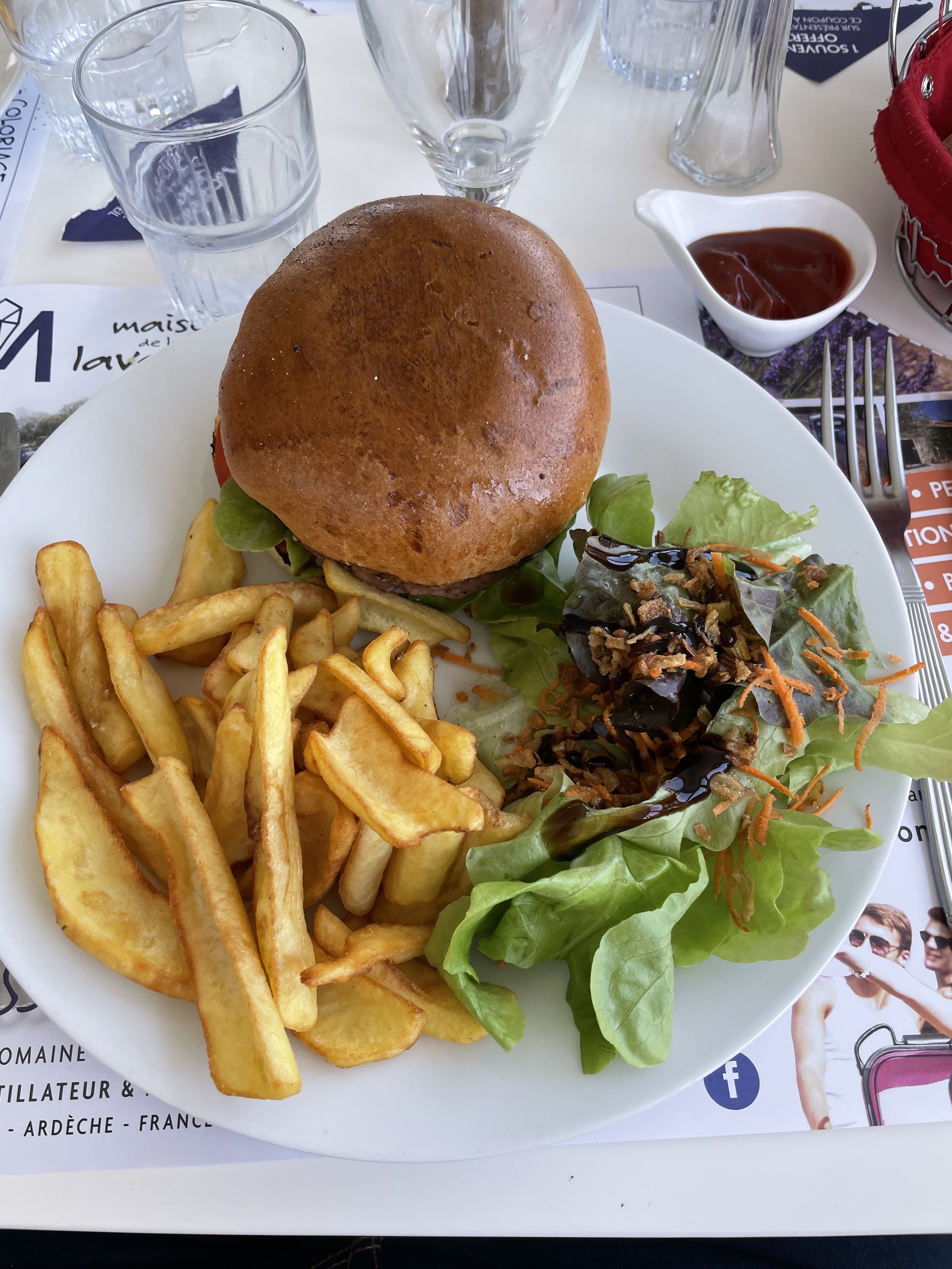 Dîner en famille à notre arrivée à La Beaume. Terrasse avec superbe vue sur l’Ardèche. Service attentionné et qualité dans l’assiette.