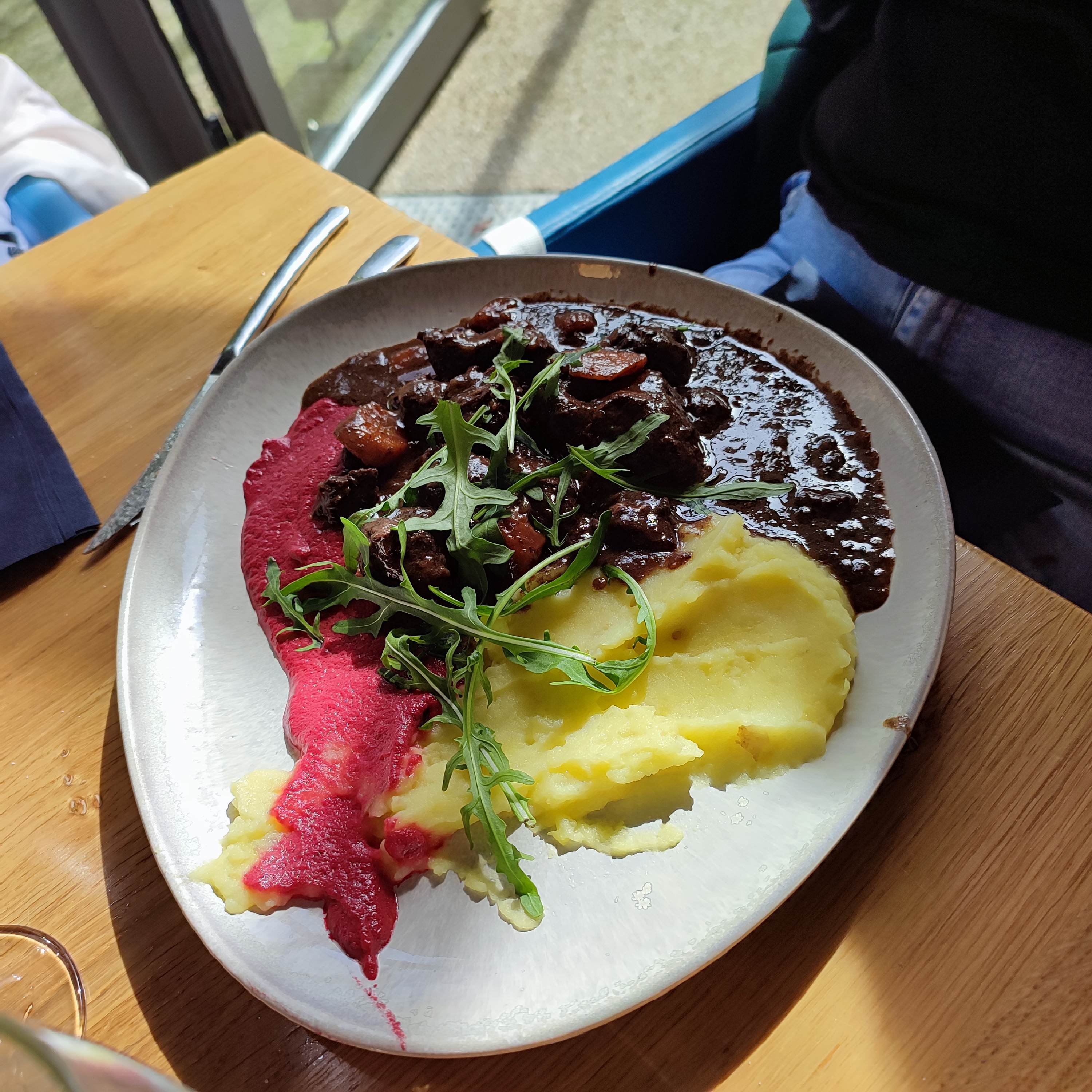 Restaurant très joli accueil très bien. Service correcte. Mais payer 35 € pour deux plats que nous n'avons même pas fini. Un tartare de saumon beaucoup trop salé, il y a le goût de la crème le goût de l'aneth le goût du sel mais on sait pas du tout qu'on mange du saumon. Pour le faux-filet façon bourguignon Au niveau viande vous avez trois beaux morceaux mais par contre les légumes sont pratiquement invisibles. Vous avez 3 bouts de carottes qui se balade dans l'assiette avec 3 champignons. La viande à un bon goût mais la texture est bizarre. Dans l'assiette, il y avait une espèce de truc orange pâle on nous a dit que c'était de la purée de carottes on a eu beau goûter et goûter et re goûter on n'a jamais trouvé le goût de la carotte.
