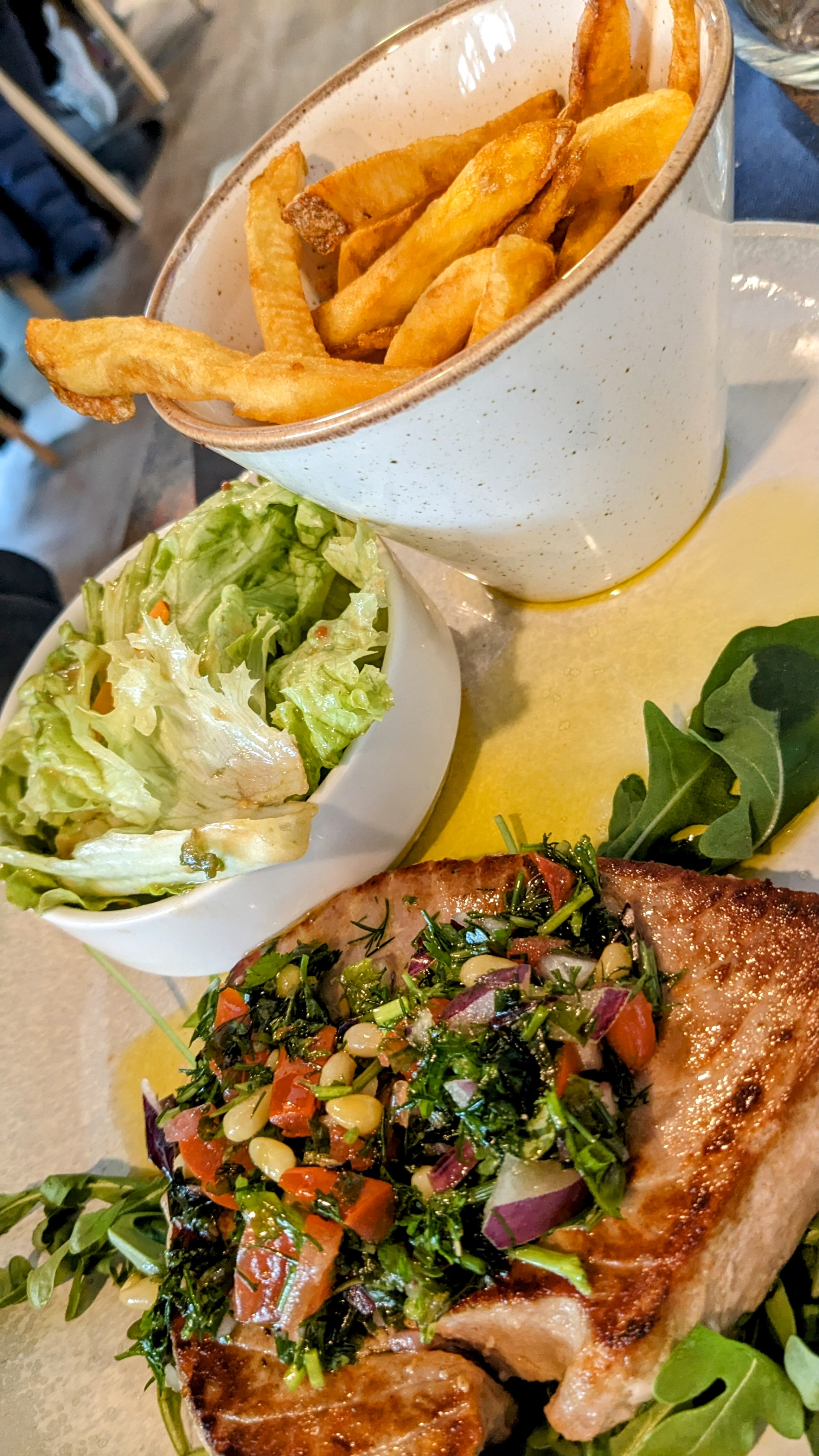 Le cadre est plaisant. Il y a un décalage entre l'entrée servi et l'entrée sur le menu (il manquait l'avocat😉). L'assiette est belle mais les légumes manque de goût. Point positif les frites et la mousse au chocolat.
