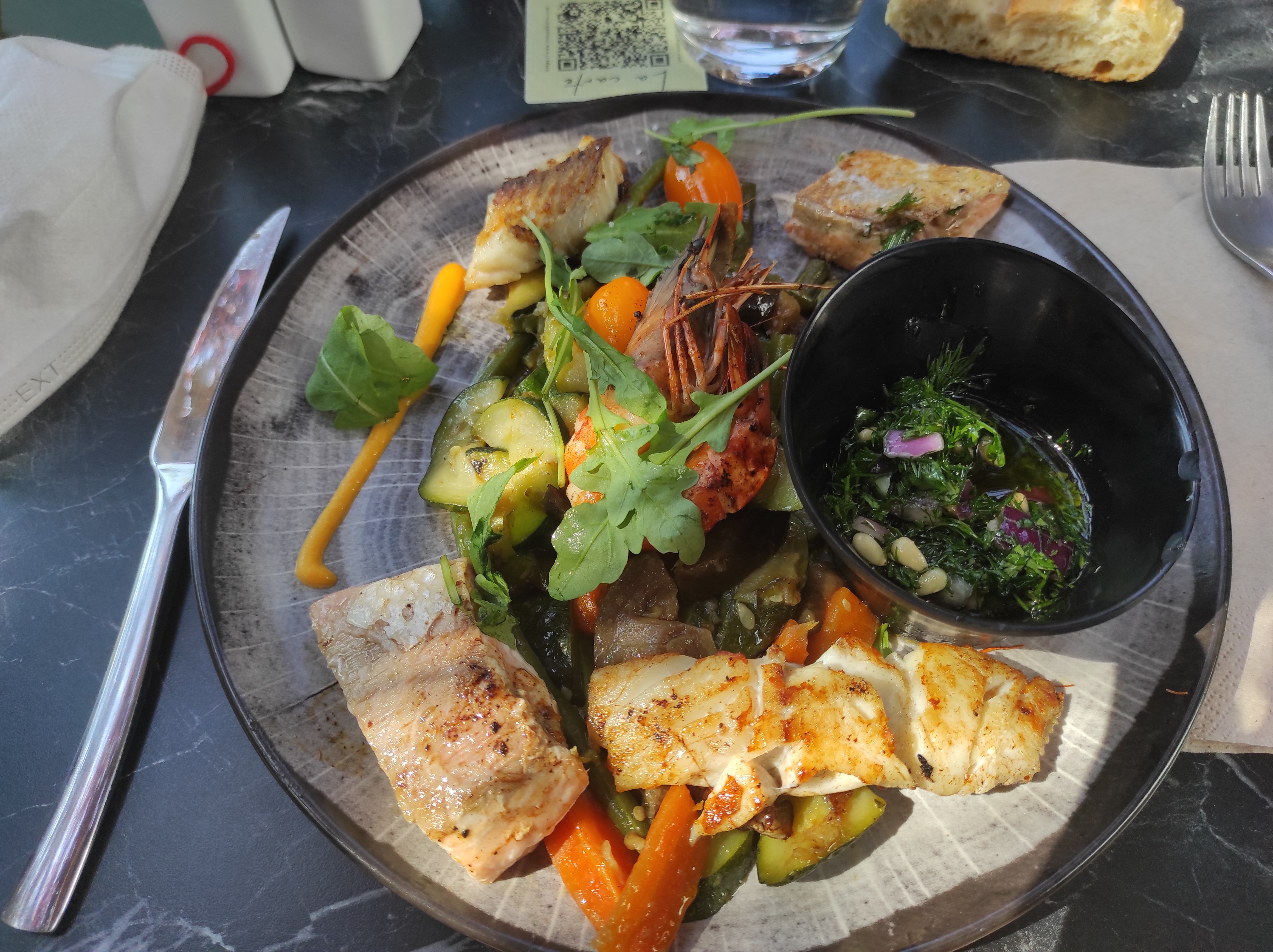 Formule entrée plat le midi. L'entrée très bonne. J'avais commandé le plat risotto aux moules et chorizo mais plus de moules, donc poisson (lieu) à la place des moules. Dommage c'était sûrement un peu moins bon sans les moules. Pas eu le temps de consommer mon dessert malgré la commande en rapide vu le temps imparti pour le déjeuner. Donc dessert annulé. Mais dans l'ensemble plats goûteux et de bonne qualité.