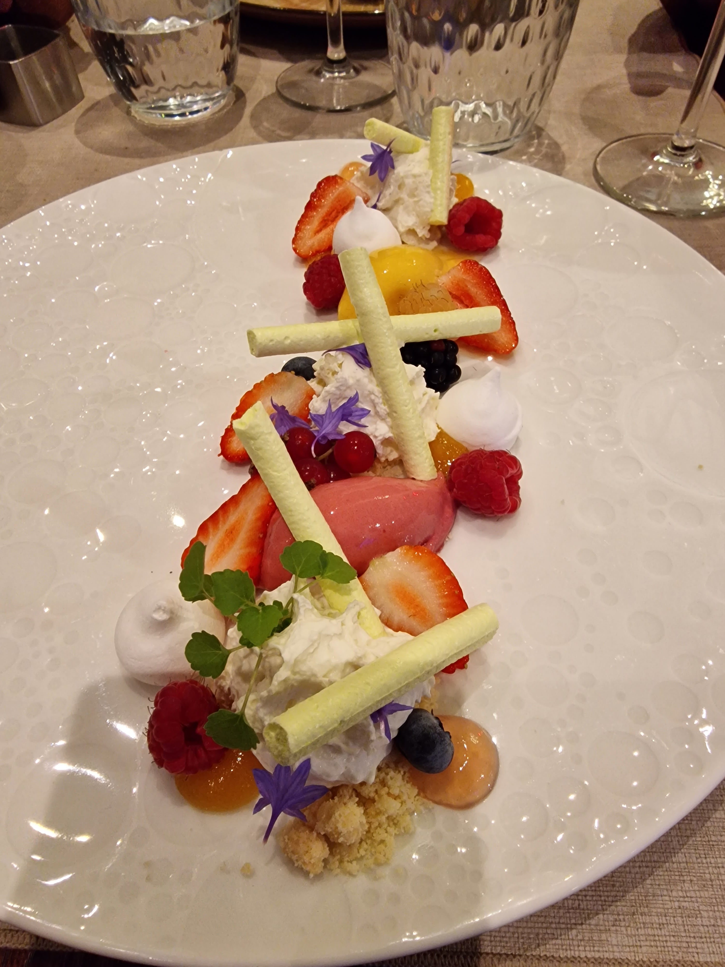 Petite déception. Énormément de gras dans la pièce de bœuf. Les desserts magnifiques dans la présentation mais pas extraordinaires en terme de saveur. Les prix sont disproportionnés par rapport aux plats proposés (40€ le plat/dessert et 12€ le verre de vin...) Le service était très bien.