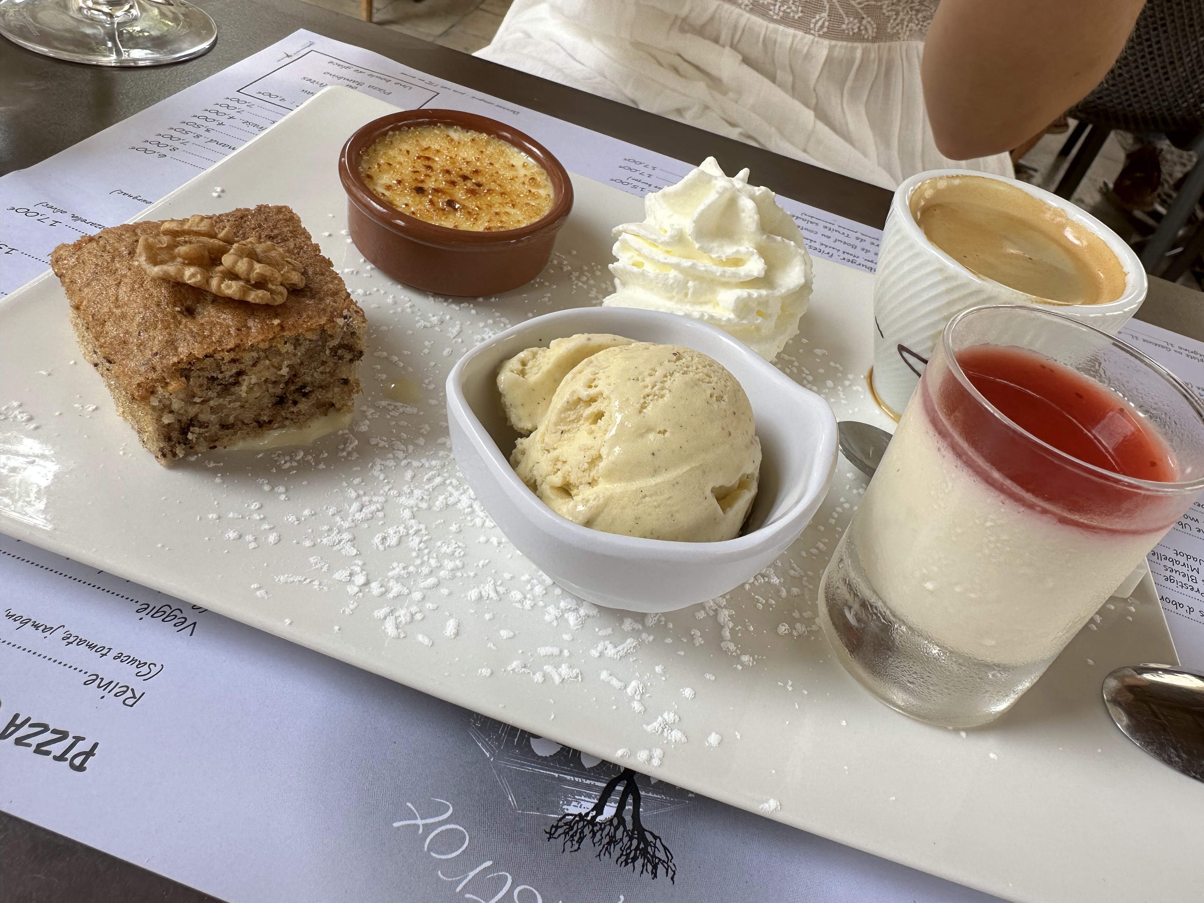 J’ai pris une pizza paysanne sans olives car je n’aime pas ça et c’était parfait! La pizza était suffisamment grasse pour me réconforter et pas trop pour ne pas m’écœurer. J’ai également picoré dans l’assiette de mon copain qui avait prit son magret de canard avec frites maison qui étaient raffinés. Sans oublier son café gourmand avec sa boule de glace, sa crème brûlée et sa chantilly: un pur régal !