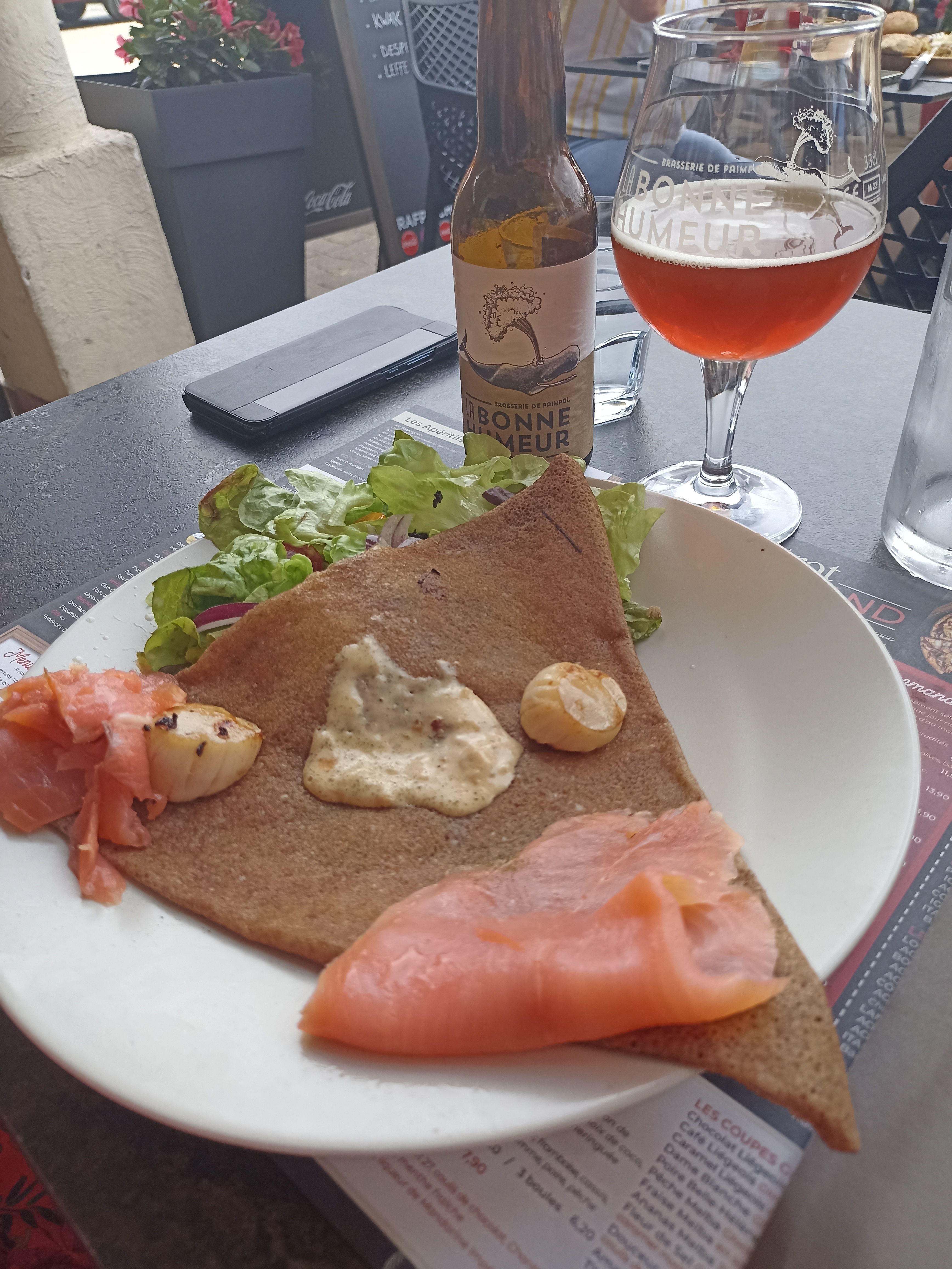 Nous avons été scandaleusement accueillis par un serveur visiblement breton qui a dit beaucoup de mal de notre Normandie natale ! Heureusement, les galettes (faites avec amour), la qualité des plats, et la petite ouverture de jus de fraise shake-shake-claque-hanche ont permis d’oublier les propos inacceptables tenus sur la qualité du cidre normand ! Enfin, le spectacle permanent son et lumière pendant le repas, et le bulletin météo sur la ville de Caen (remercie ta maman pour cette info finalement utile), nous ont fait passer un de nos meilleurs moments de ce séjour ! Note pour la patronne : c’est trop cruel de le faire travailler comme ça un jour de grand prix de formule 1 ! On sent qu’il est à bout :) Signe : les clients normands, mais néanmoins préférés de la journée (sans vouloir se la raconter)