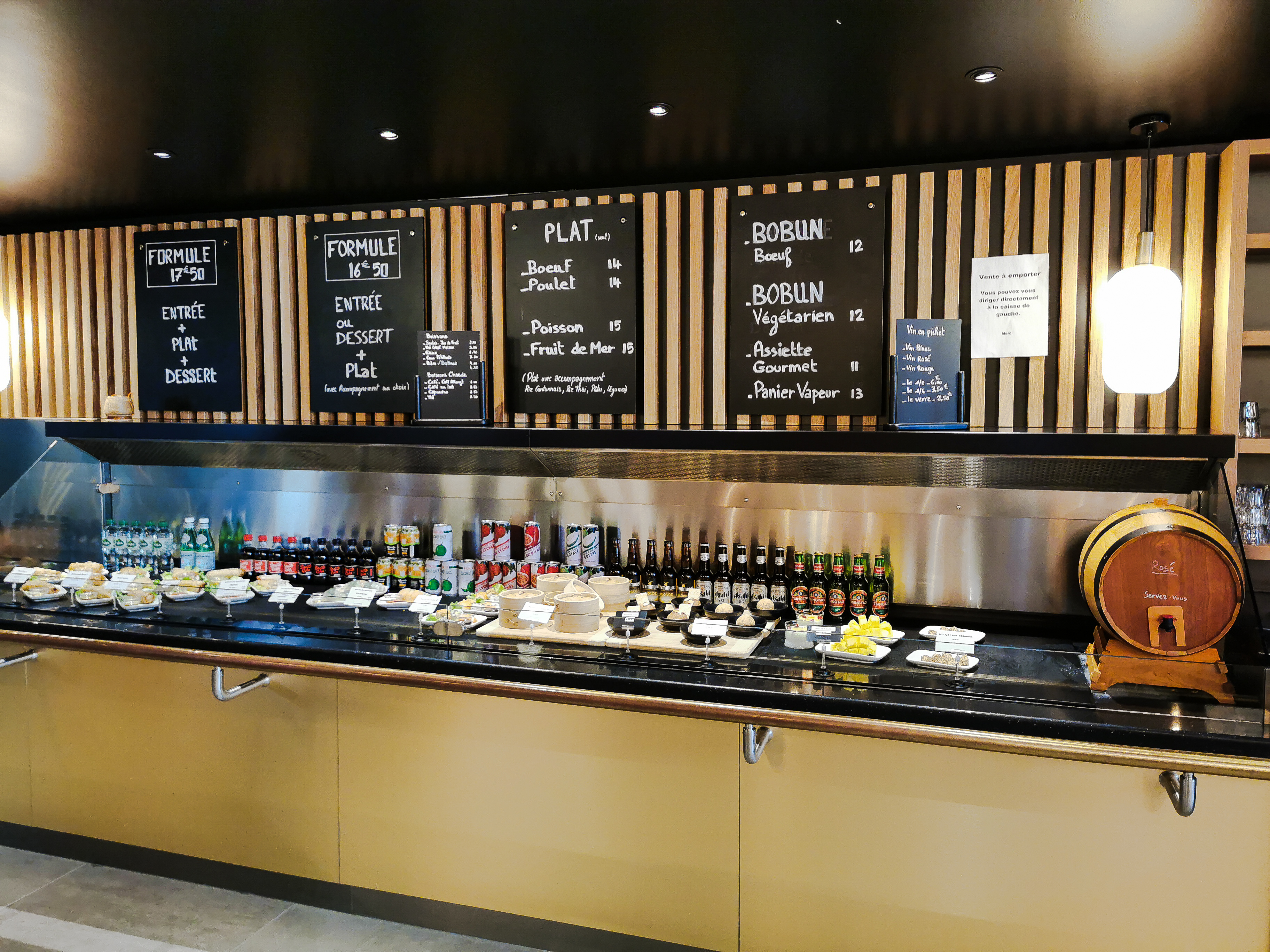 Ici beaucoup de plats classiques inerrants aux traiteurs chinois français. C’est excessivement sucré et gras, pas de grande finesse, mais cela reste très plaisant quand on souhaite ce genre de cuisine réconfortante et régressive. On y trouve aussi des bo-buns et des sushis.