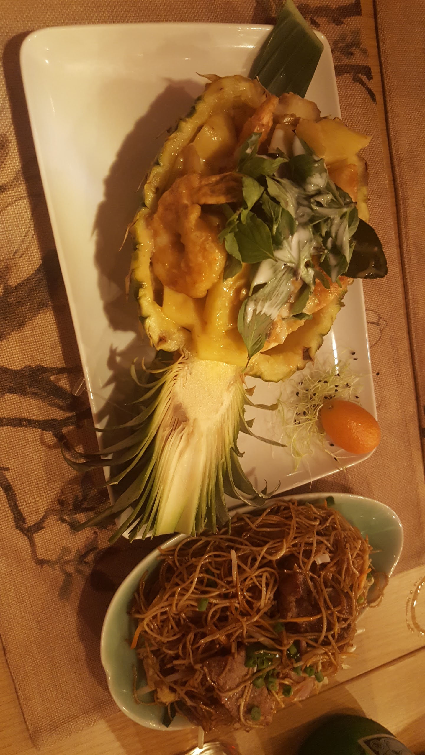 Cadre agreable . Serveur souriant et à l écoute malgré notre arrivee tardive. Sauce des gambas dans l ananas excellente !