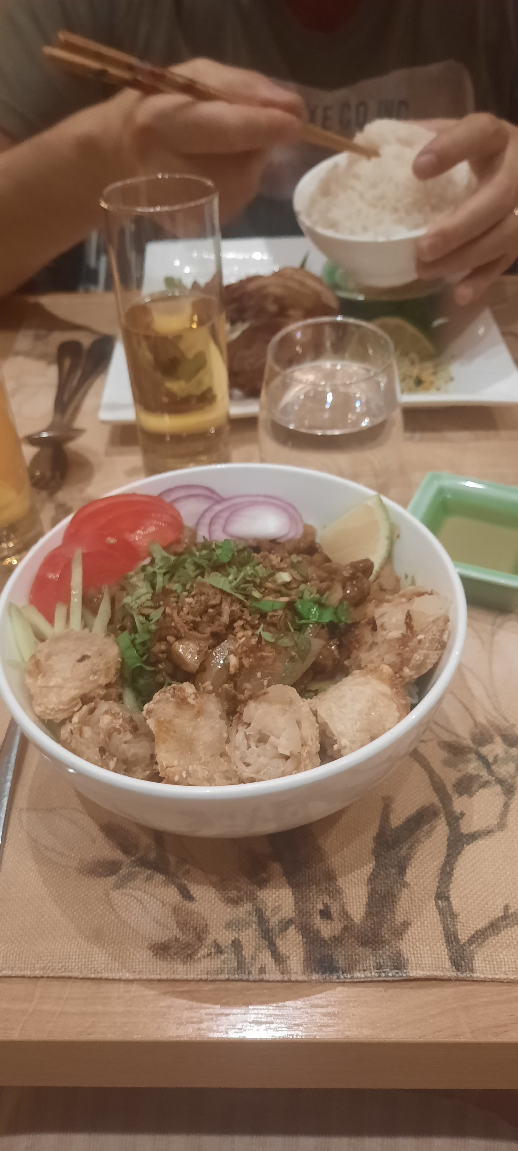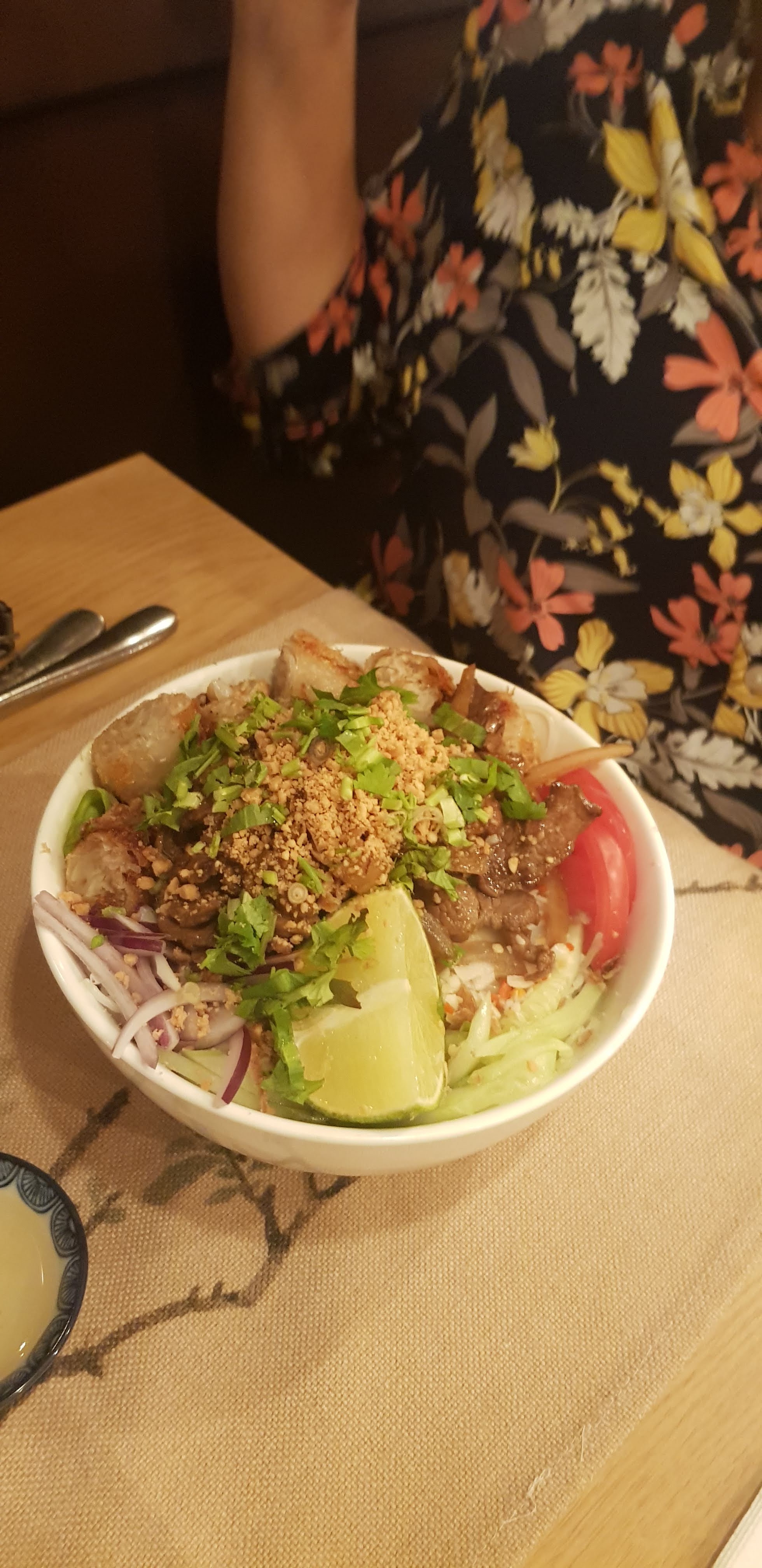 C'était franchement degueu. Nous avons été malades toute la nuit. Nous avons été servis en 5 minutes top chronos, ce qui prouve que tout est surgelé. Mon bobun végétarien était raté ce qui est quasi-impossible. Trop de sauce, trop salé, trop de tofu, tofu ressemblant visuellement à du carton mouillé d'une ruelle sordide de Pékin, heureusement qu'il n'avait pas de goût finalement. Une soupe de crevette hyper salée. Comme quoi quand on ne sait pas cuisiner, le sel est vraiment miracle. Voilà nourriture 0. En revanche le serveur hyper sympa. A fuir.
