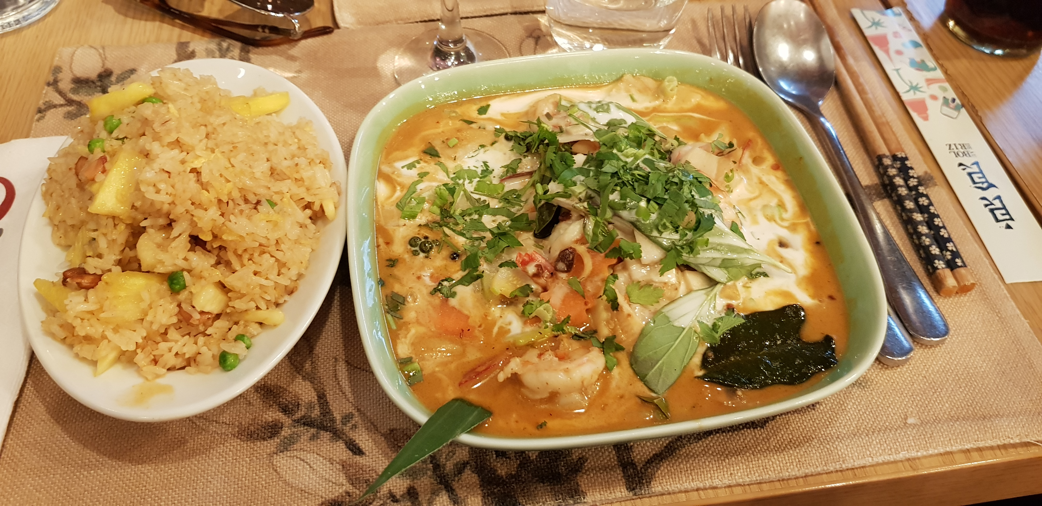 Belle présentation des plats avec reservice des décorations : ananas évidé, fleurs comestibles, ... entachés des plats précédents. Merci pour l'hygiène. A vouloir tout faire niveau spécialité on ne fait rien de bien, ni de bon. Les deux plats que nous avons gouté ont été cuits dans le même Wok. Du coup les deux avaient la même saveur (PadThaï vs RizMague) Ajouté au fait que nous avons pas été obligé de visiter les toilettes 3 fois dans la nuit qui a suivi (je passe les détails). Je ne comprend pas la hype vu le service. De notre côté la pub est faite. L'offre est très large à quelques stations de métro pour ne pas risquer pire que cette mini intoxication
