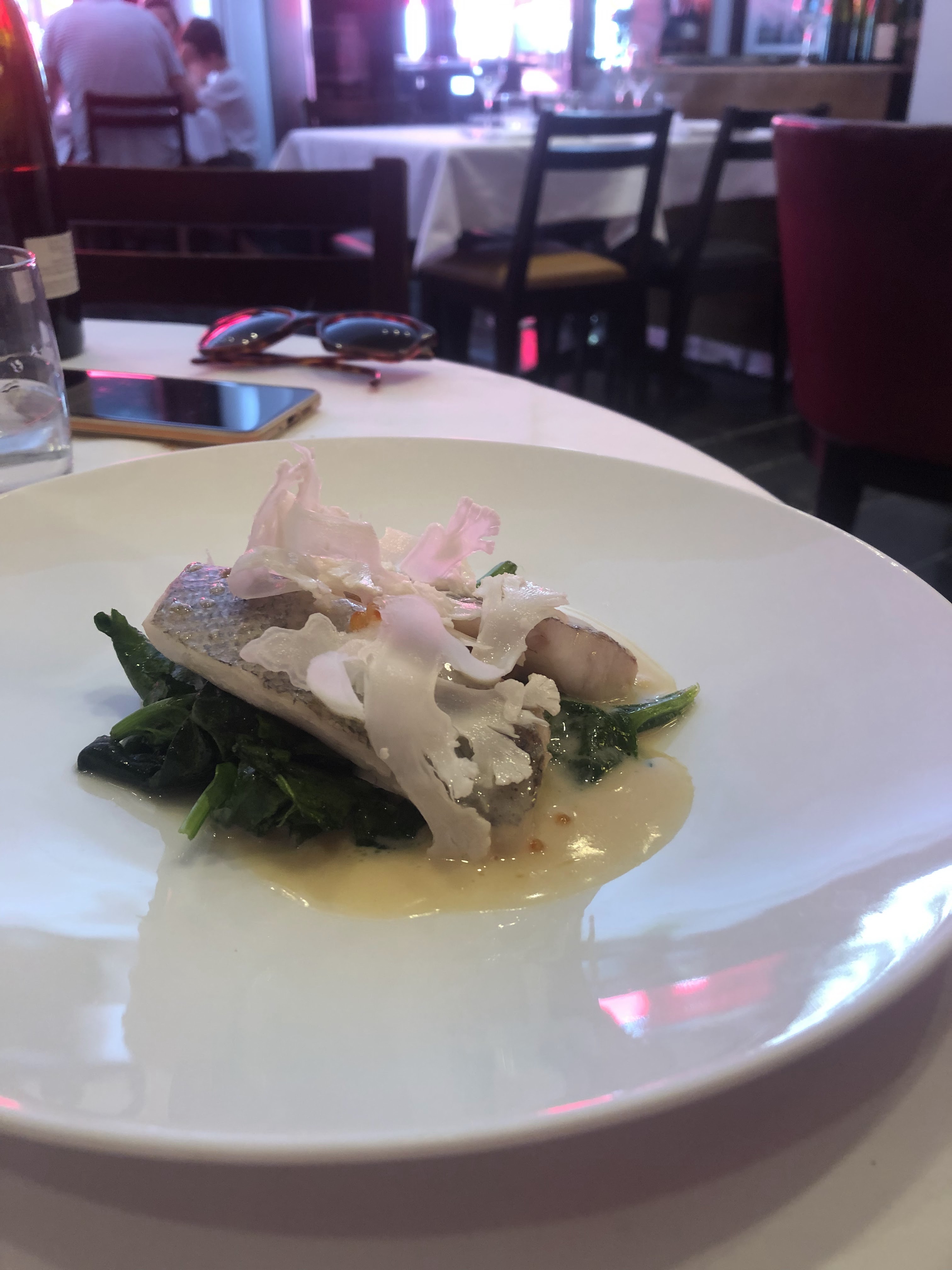J’ai été très agréablement surpris par ce restaurant. Même s’il y a quelques détails à améliorer, d’après moi, il reste proche de la perfection et mérite un avis 5*. Pour commencer, le menu entrée-plat-dessert à 39€ est imbattable. J’espère qu’ils n’augmenteront pas les prix. Le service plutôt bien (sauf le serveur qui ne sais pas trop servir le vin et qui en met un peu partout sur la nappe). J’y suis allé pour le déjeuner avec des collègues et donc j’ai eu la chance de goûter plusieurs plats. Personnellement, j’ai commandé un Tataki de veau que j’ai beaucoup apprécié. Je vais reprendre la même chose si j’y vais encore. La viande, suffisante en quantité, peu cuit comme il faut, avec une base en caviar d’aubergine et une mousse en sauce était un vrai délice. En plat, j’ai eu le poisson du jour, une petite queue lotte entière. La portion était un peu petite et le poisson un peu trop cuit à mon goût. Je préfère le poisson plus juteux. Par contre, la petite sauce était vraiment goûteuse et les épinards en accompagnement m’ont réconcilié avec ce légume que je n’aime pas d’habitude. Mon coup de cœur était le dessert. Simple en description et en presentation, le gâteau de fromage était carrément le meilleur que j’ai mangé jusqu’à ce jour. Pas trop sucré, on y sentait bien le fromage. Les bémols : le cadre est un peu trop sérieux, on imagine bien y aller pour un déjeuner d’affaires mais un peu moins entre amis ou en famille. L’intégralité de la table a déploré le manque d’accompagnement avec le plat principal. Je leur conseillerais de servir une petite portion de purée bien beurrée et onctueuse dans des petits cocottes par exemple avec la lotte ou encore le gigot et l’échine de porc. Nous nous sommes tous acharnés sur le pain (sans plus) et c’est bien dommage. Bon, finalement, c’est un très bon restaurant avec des petits défauts qui sont faciles a corriger. Le prix très raisonnable justifie encore plus mon sentiment et mon avis. Je travaille à quelques rues de là et j’y retournerai. C’est sûr !