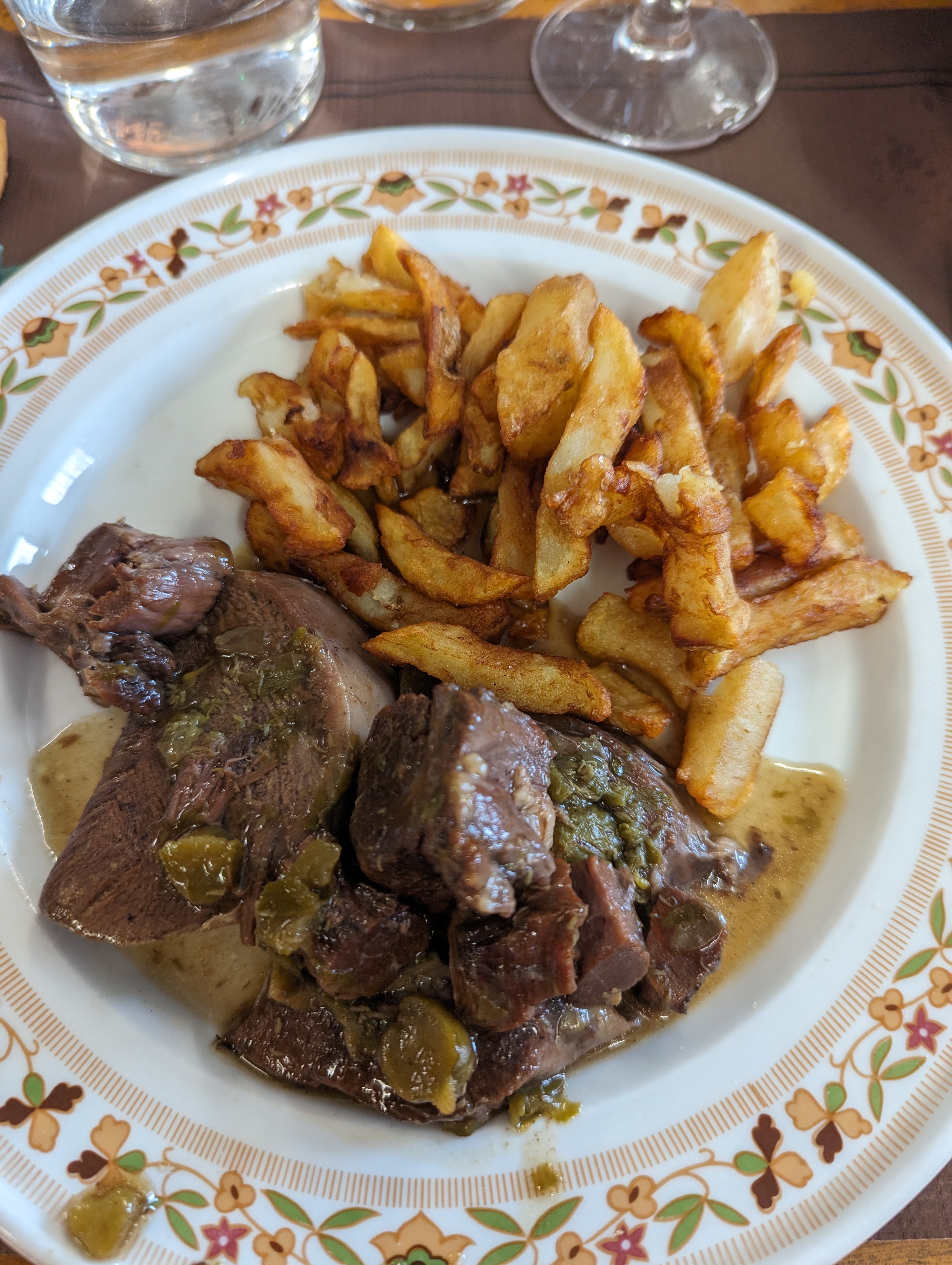 Un jour de féria en terrasse super assiette de dégustation tête de veau, pied de cochon et tripes. Les enfants assiettes de gambas, risotto et une pièce du boucher. En prime une belle rencontre à notre table, avec des dames du coin, très sympathiques