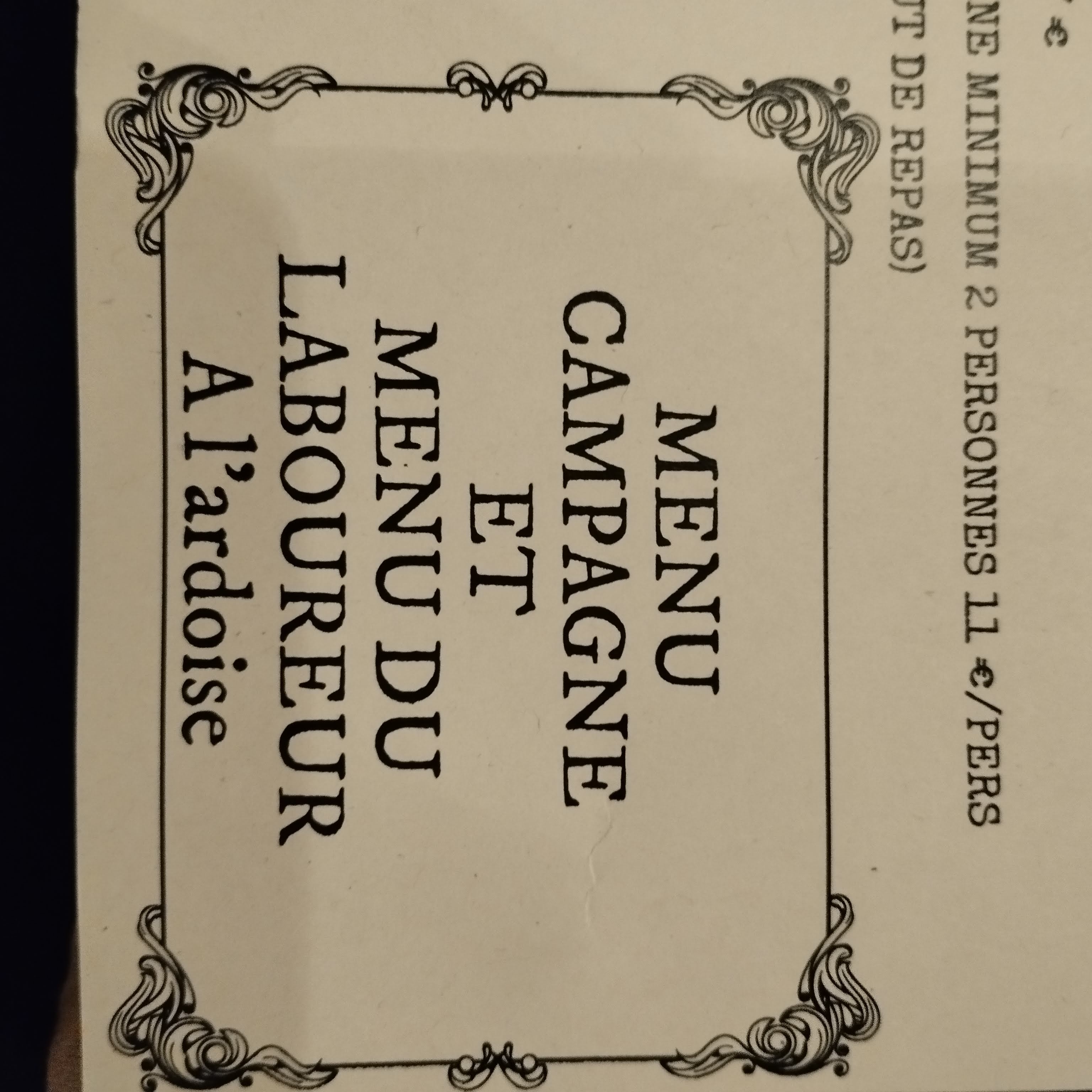 Très bon repas Ne pas hésiter à prévenir par téléphone de votre venue (voir de votre menu si vous voulez tous tester le foie gras !) Tous les plats sont servis en portion généreuse et le service est exemplaire. Salade de chèvre chaud et jambon, terrines, saumon mariné façon gravelax et d'autre encore pour les entrées. Souris d'agneau façon tajine , filet de bœuf sauf au poivre, risotto au lotte et parmesan, sautée de veau aux cèpes, dos de saumon à la sauce à l'oseille en terme de plat. En dessert on peut avoir des îles flottantes, moelleux au chocolat, profiteroles, tarte aux citrons meringués ou encore nougat glacé Bon appétit !