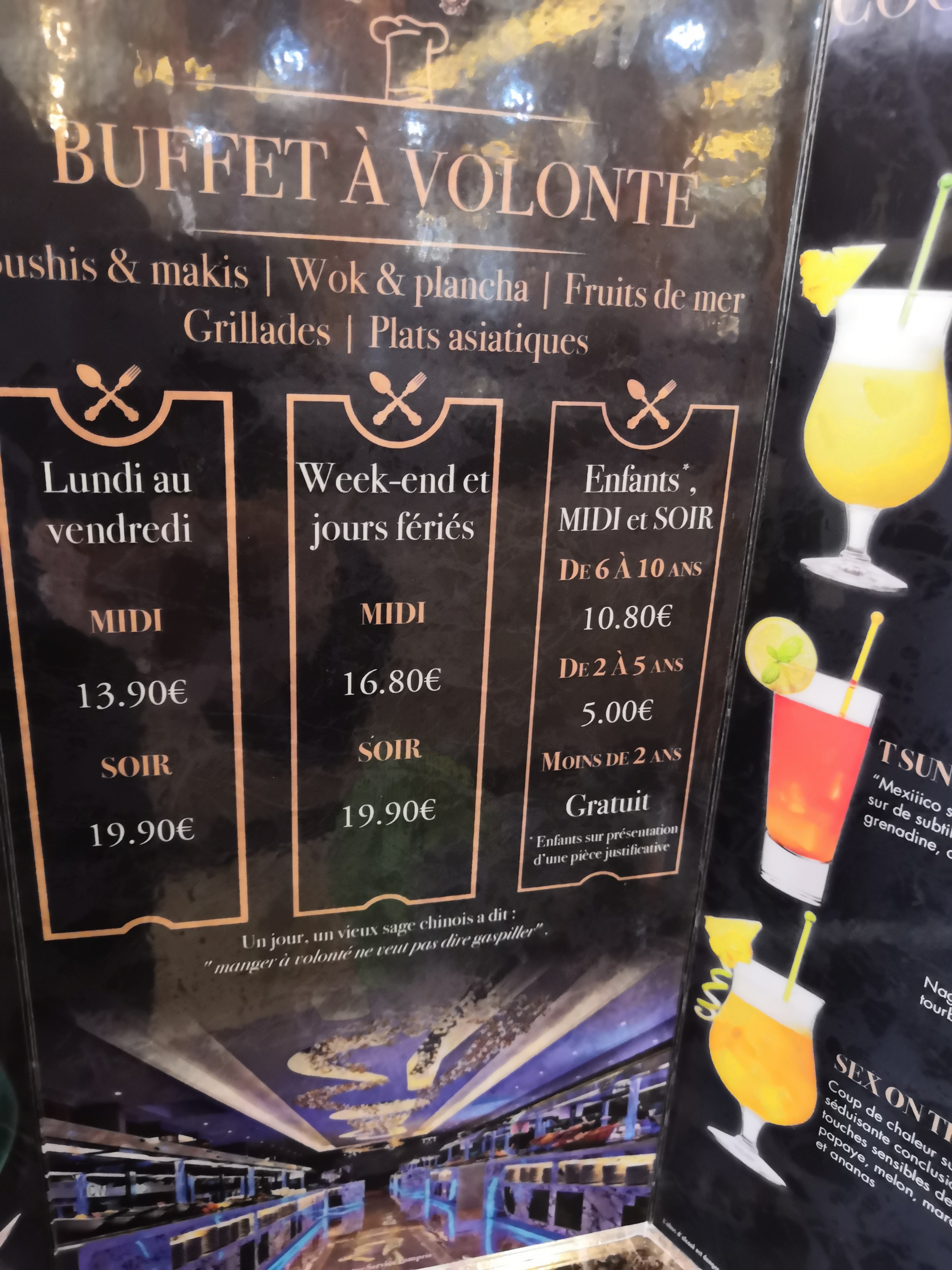Encore un grand restaurant dédié à la cuisine asiatique à volonté. Devanture qui parle de cuisine du monde mais elle se limite à la cuisine asiatique. On trouve un plat viande Kebab (très bonne d'ailleurs)...mise à part ça rien de bien spécial qu'on ne trouve pas dans un autre restaurant de ce type....Le grand Buffet de Lyon à le même procédé. En tout il faut compter 65€ sans les boissons pour adultes. Dans le menu enfant la boisson est comprise mais il faut avoir max 10 ans.