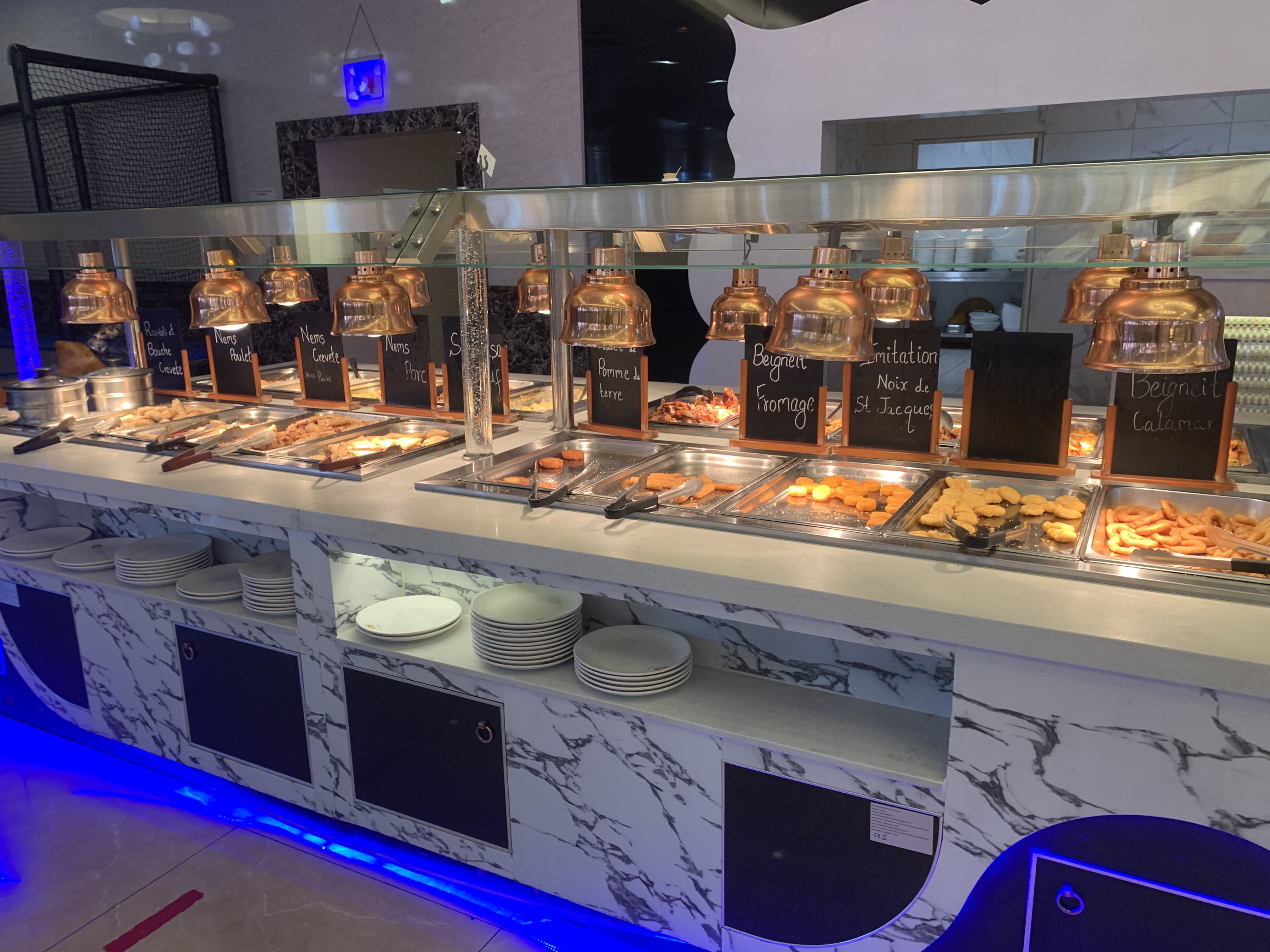 • Surface gigantesque spacieuse très jolie décoration avec plusieurs salles, espace jeux pour les enfants • Très grand choix de nourriture pour tous les goûts plusieurs buffets d'entrées, plusieurs buffets de plats et plusieurs de desserts. • Toilettes propres. • Prix largement correct pour tous ce qu'il y a. 20€90 le soir en weekend. Si vous aimez manger plusieurs saveurs de différents pays allez y vous serez servis. Je recommande vivement ✅