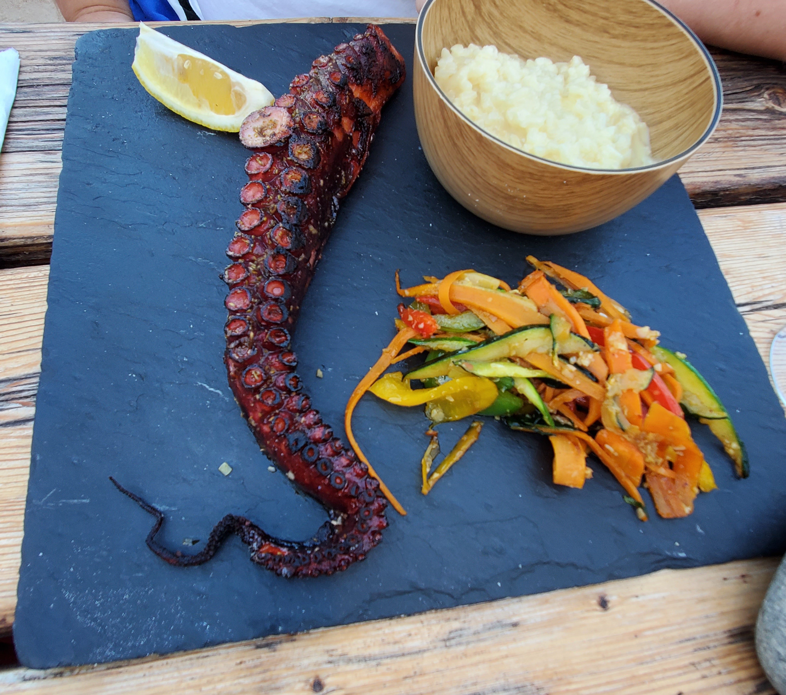 Très agréable et surtout très bon seiche à la plancha rissoto salade tout est parfait