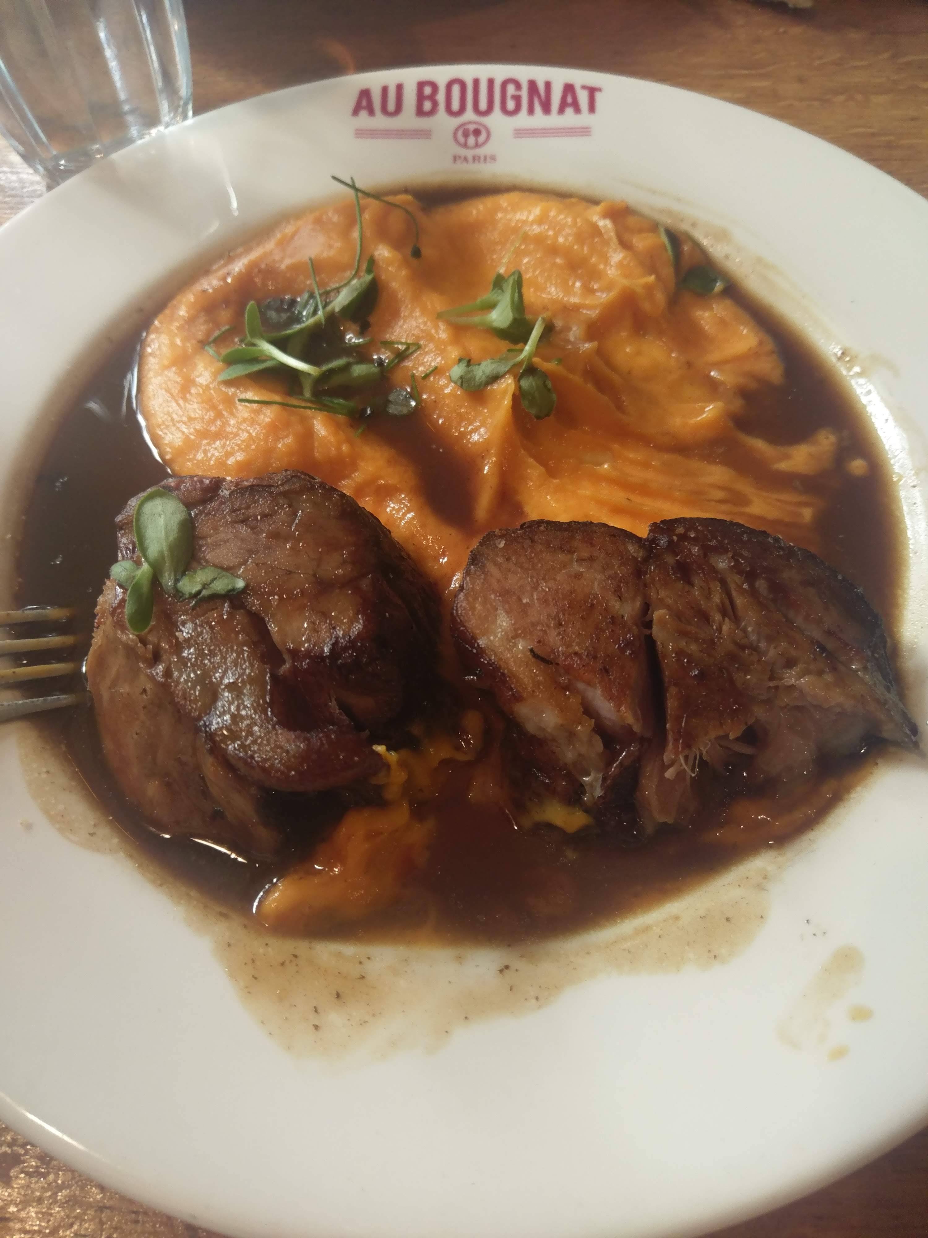 Ça faisait des années que je passais devant ce restaurant en me disant que je devrais l'essayer et je n'ai pas été déçu ! Œuf meurette réussis (pas si simples à trouver sur Paris) et canette au jus de viande et son aligot délicieux. Le vin était de très bonne facture pour un restaurant de cette envergure. Seul petit bémol, le plat était tiède, mais la qualité gustative a pris le dessus. Aucun regret, j'y retournerai pour faire découvrir le Bougnat à des amis.
