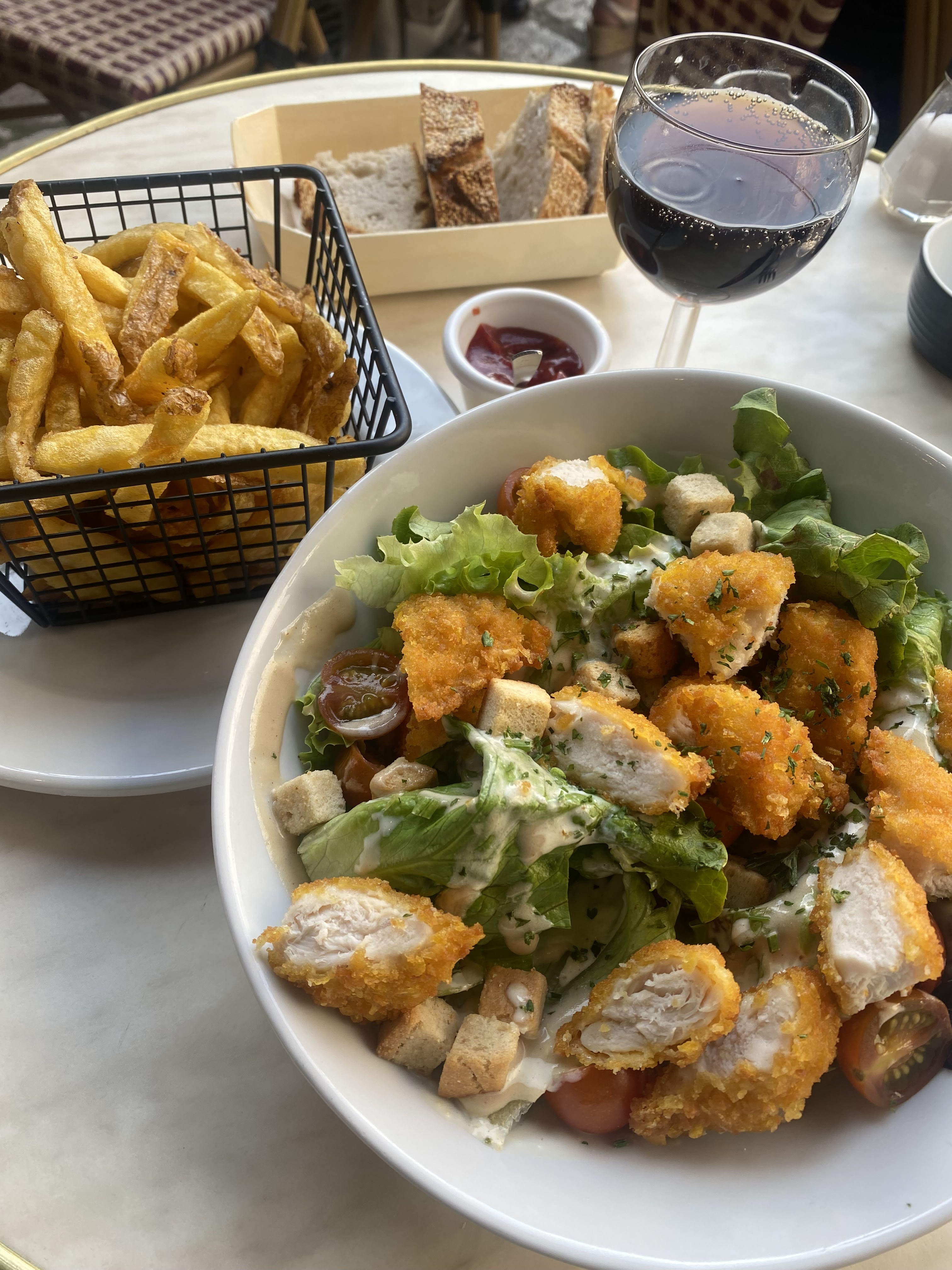 La salade césar est très bonne avec de beaux morceaux de poulets panés et croustillants, et une sauce délicieuse. Enfin une vraie salade césar comme on les aime Un « très très bon » !!! 😉