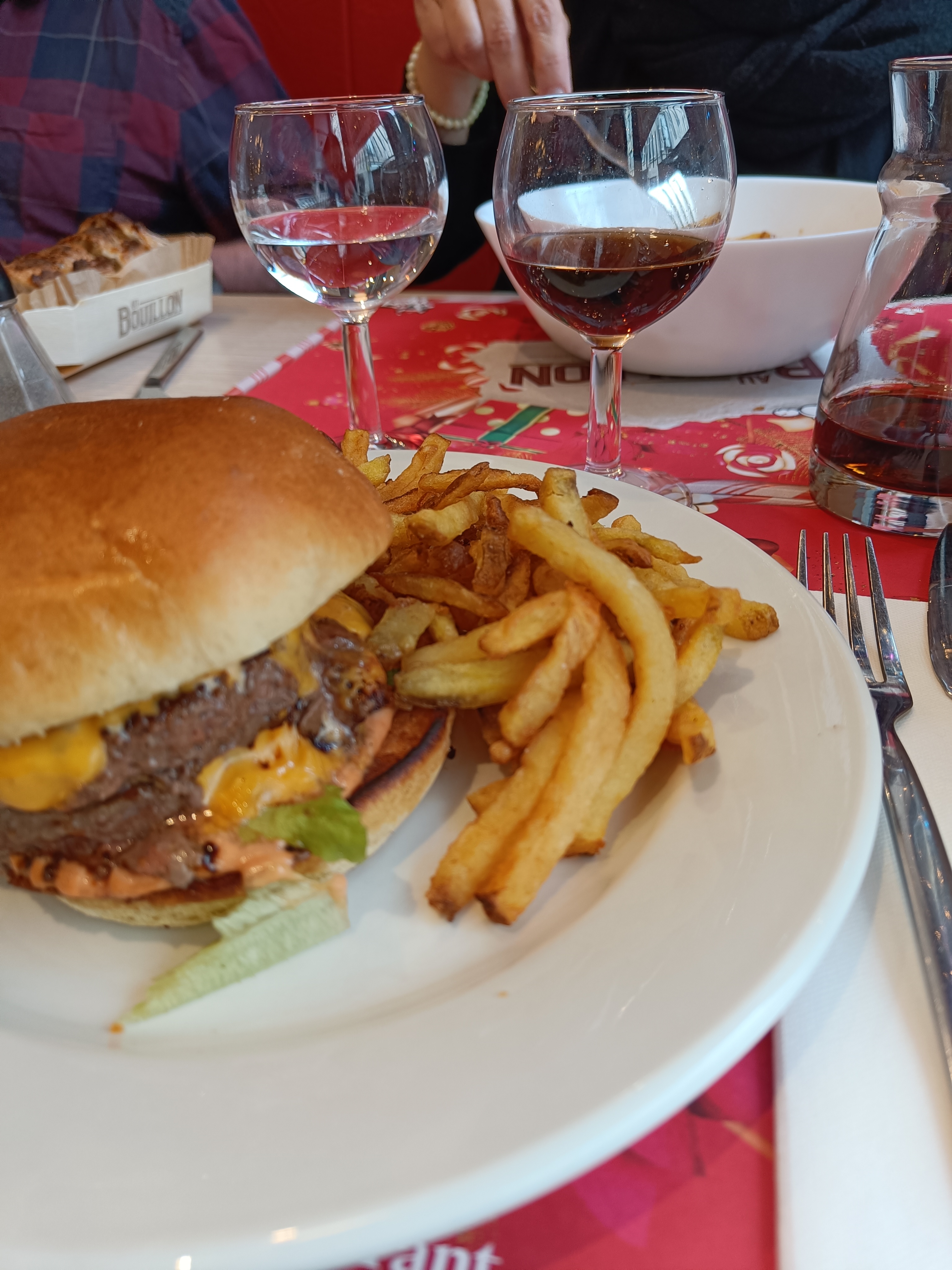 Bon accueil, prise de commande laborieuse, difficile de prendre une commande avec quelqu'un qui parle en même temps dans les oreillettes !!! Hamburger et frite très bonne , mais dommage que le camembertiflette soit fait avec des pommes de terres en boites !!! des supplément pour les sauces , plutôt moyen 🫤Ambiance bruyante et la table à droite de la porte d'entrée en courant d'air à chaque sortie des serveurs.