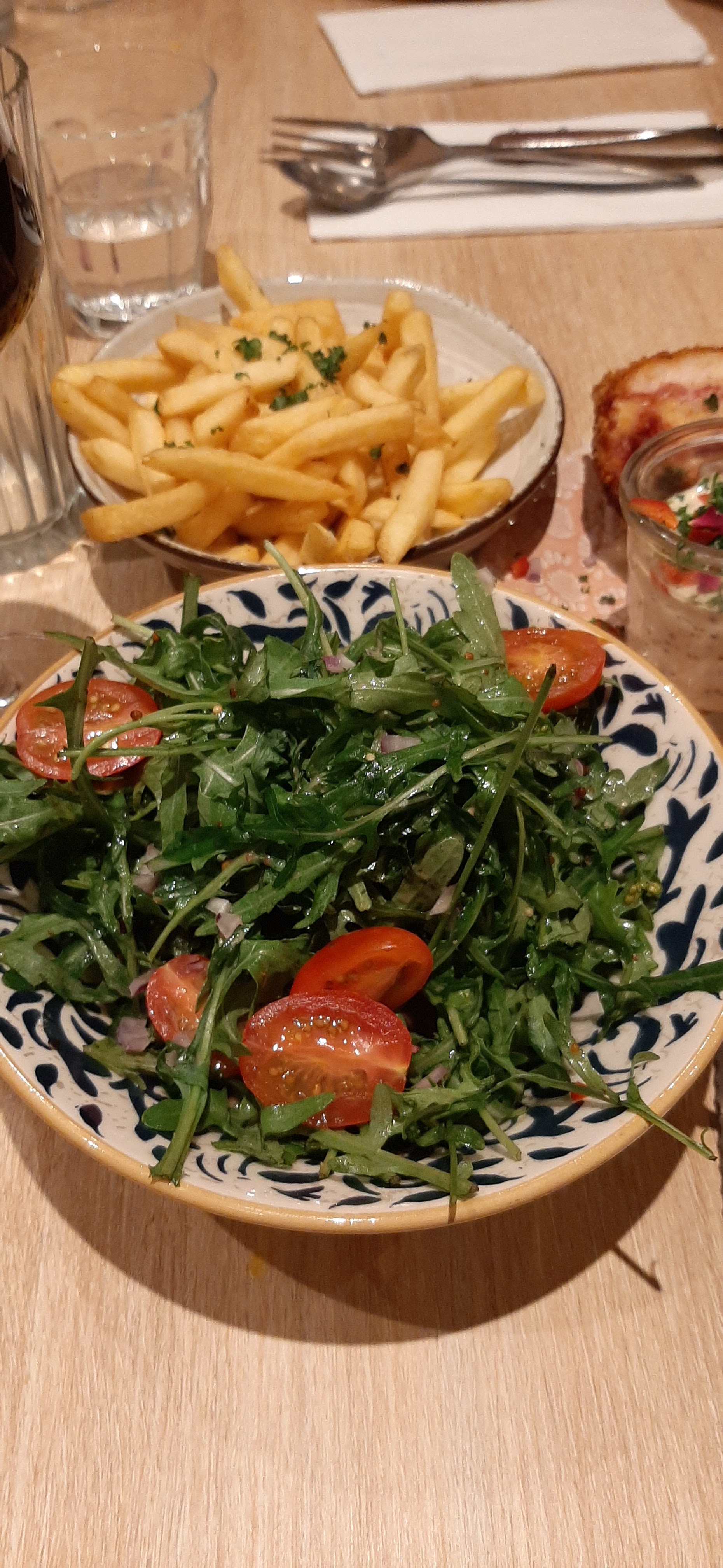Prise de commande a 19h25, servi a 19h39. L'accueil et le service était très agréable. La nourriture était très bonne et les prix pas exorbitant vu les prix parisiens. La bavette (18 euros) était accompagné d'un très bon jus de viande ainsi que de pickles d'oignon et de cebette. J'ai pris la salade en accompagnement, il y avait de la roquette, des tomates et de l'échalotte.