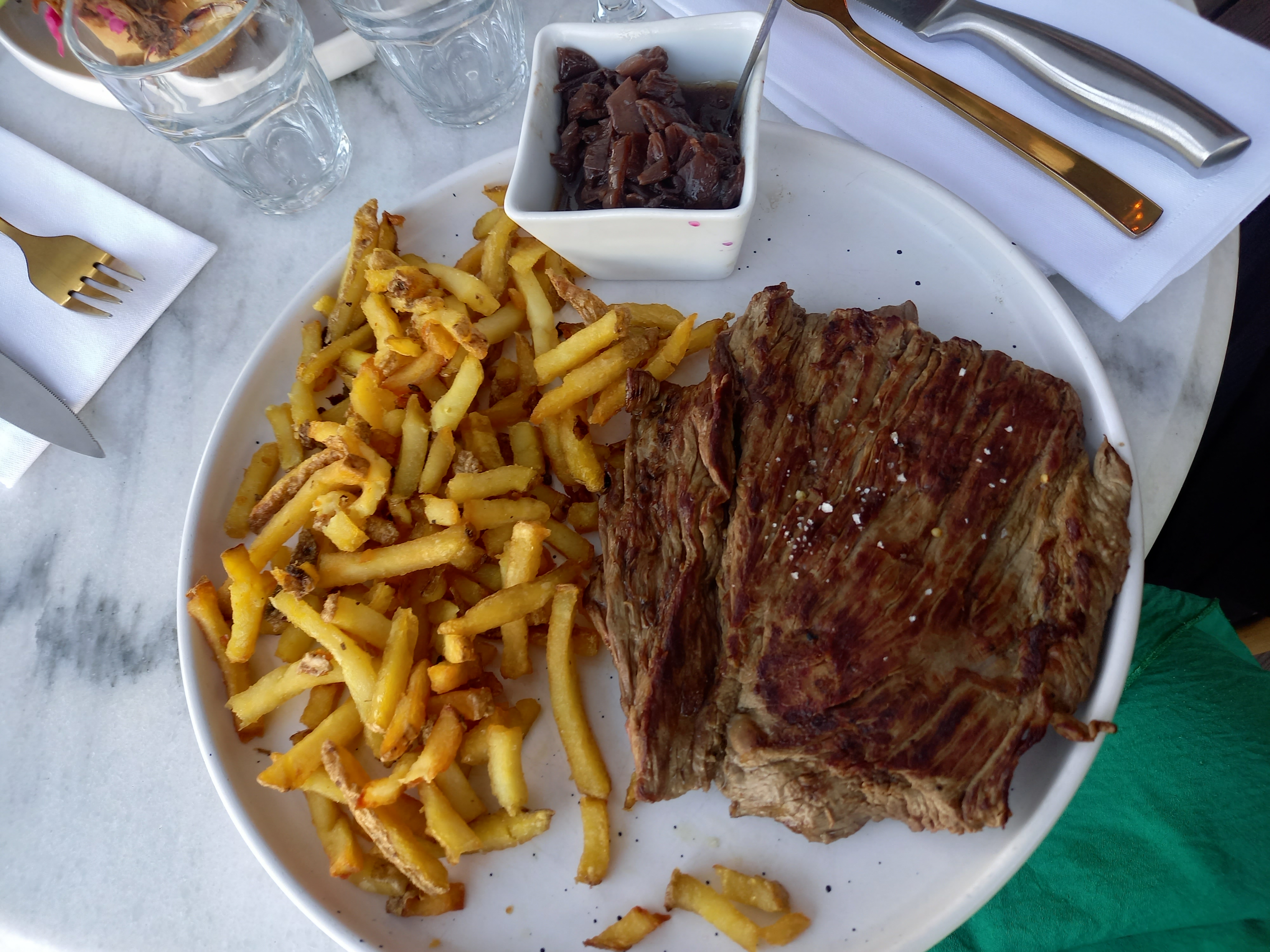 Bel endroit avec vue sur l’entrée du port et la tour Joséphine. Accueil et service sympa. Nous avons commencé par la grande planche apéritive (tartinades, chiffonnade de jambon et pickles d’ananas) qui était très bien. Ensuite tartare argentin (très bon) et bavette un peu décevante (pas très grosse, fondue d’échalotes pas aboutie)