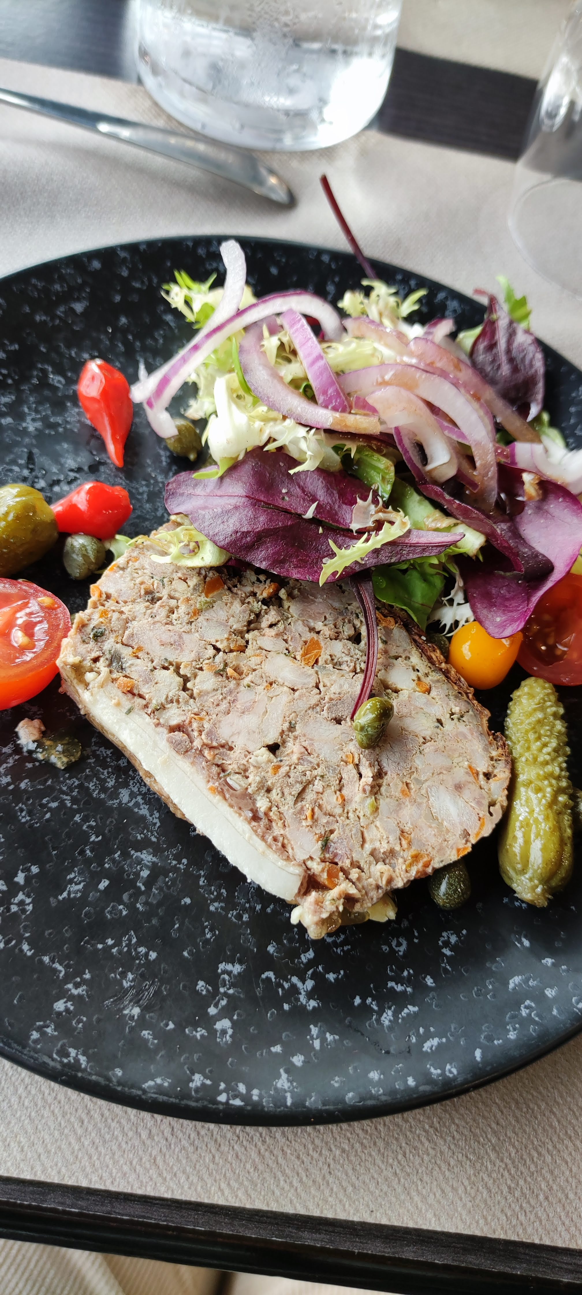 Plats servis beaucoup trop rapidement (les verres apéritif ne sont pas vides que le vin arrive...). Le personnel revoit la configuration des tables à proximité de notre table. Viande froide + pâte a tarte non croustillante citron meringuee