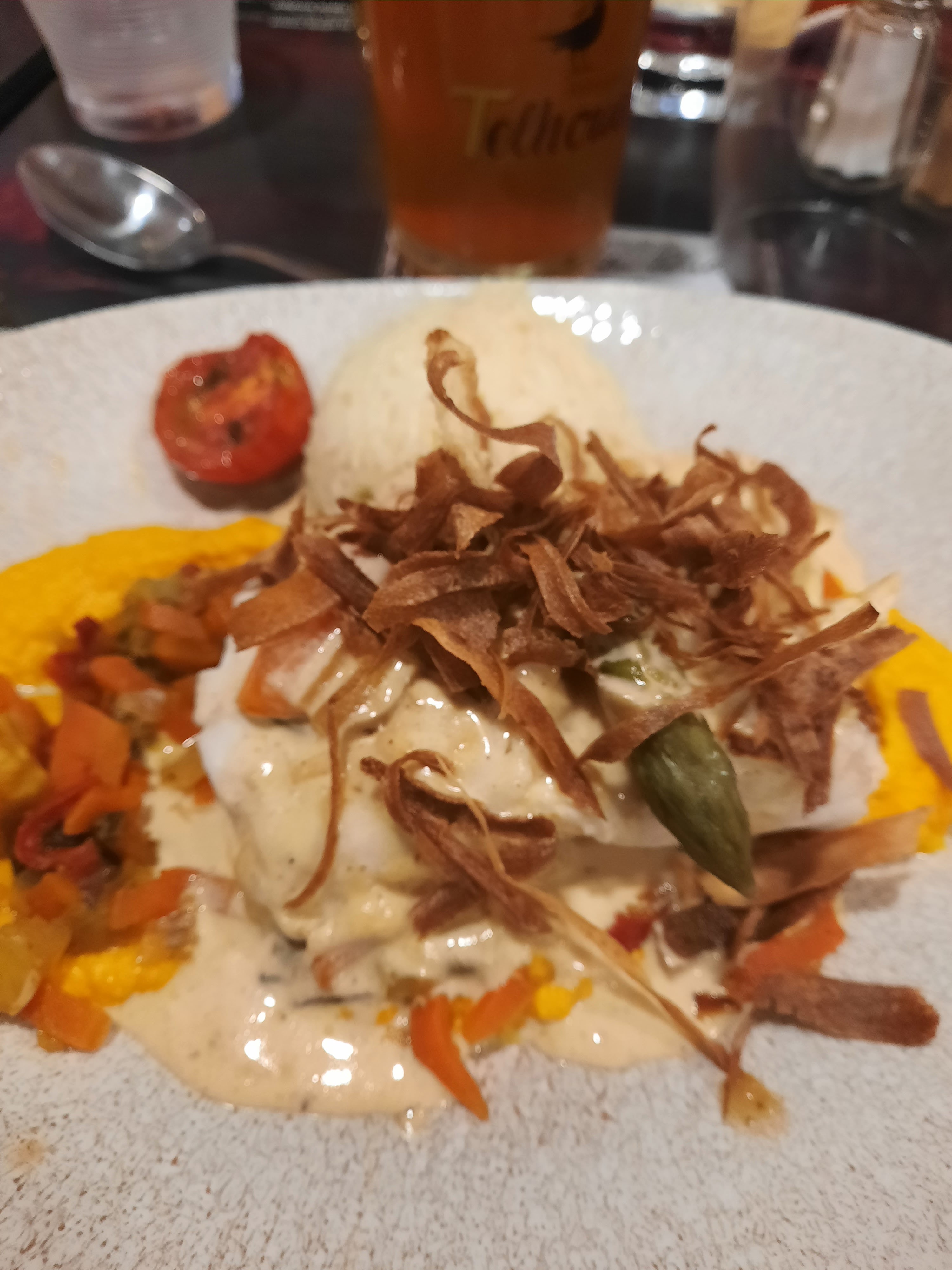Cuisine fade et sans saveur. Poisson trop cuit, pas assaisonné. Les légumes étaient bons mais il y avait une toute petite cuillère dans l'assiette. Le burger de mon mari très fade également et un morceau de verre au fond du café pour clôturer le repas...