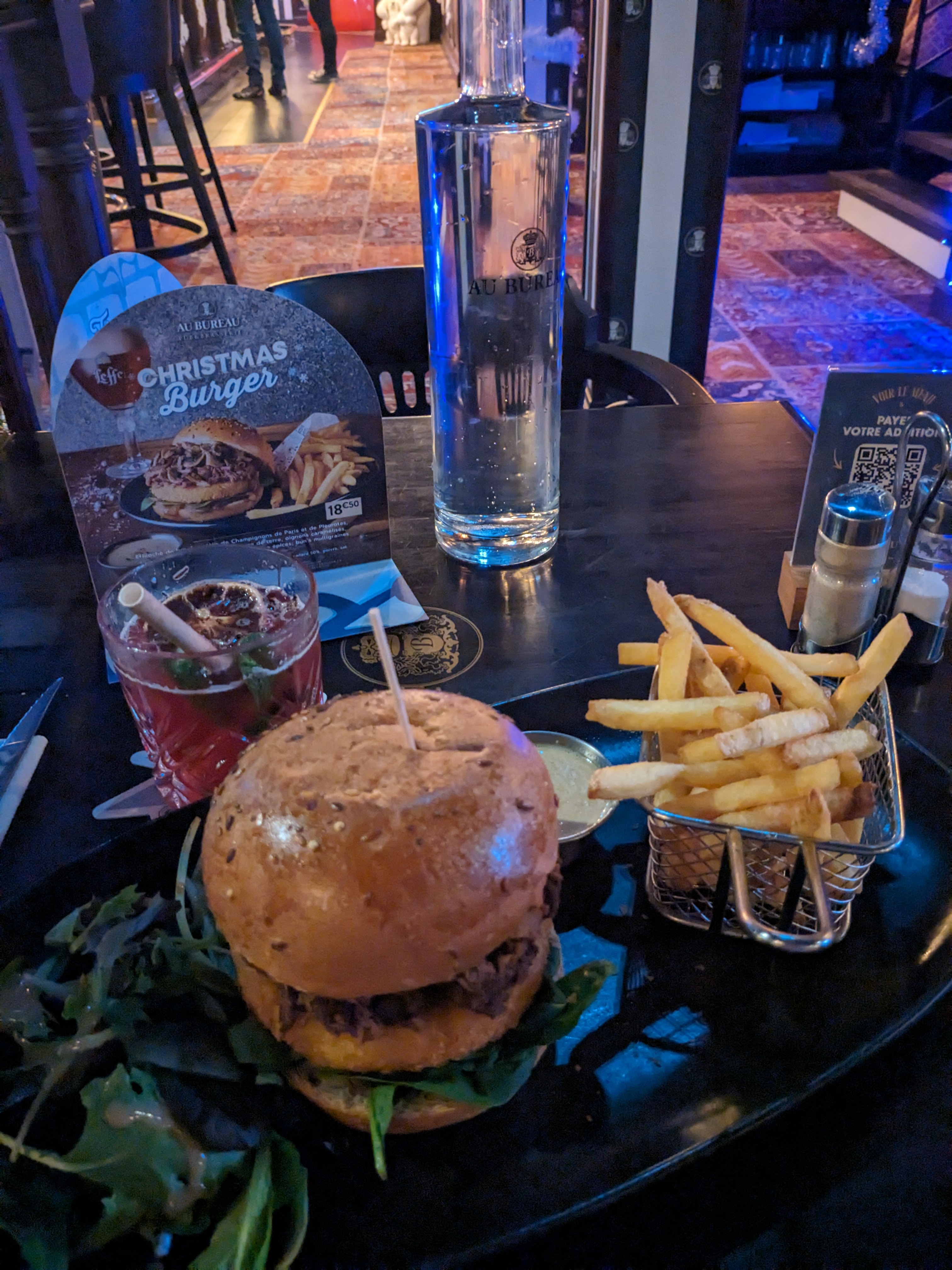 Vraiment une très bonne soirée. Le floral gin m'a vraiment plus avec ses petites touches de vanille et épices. Quand au burger du moment Christmas Burger, j'ai adoré l'association des 4 épices avec ce parfum de cannelle qui est surprenant mais vraiment agréable en bouche. Le dessert au café n'a pas ternie le tableau. Une équipe vraiment agréable en tenue de circonstance à aussi contribué à ce que je passe un très bon moment. Bravo 👏👏