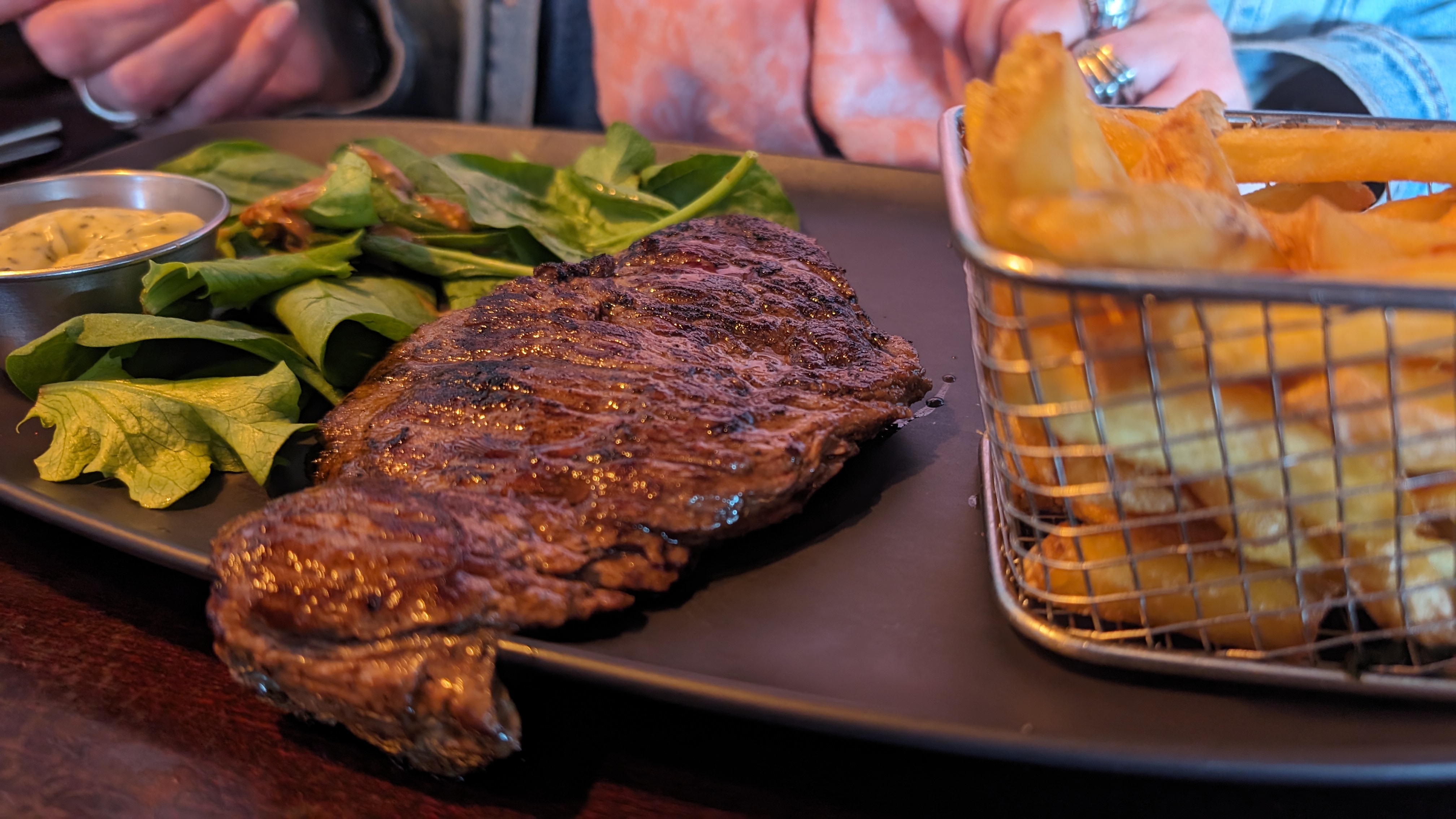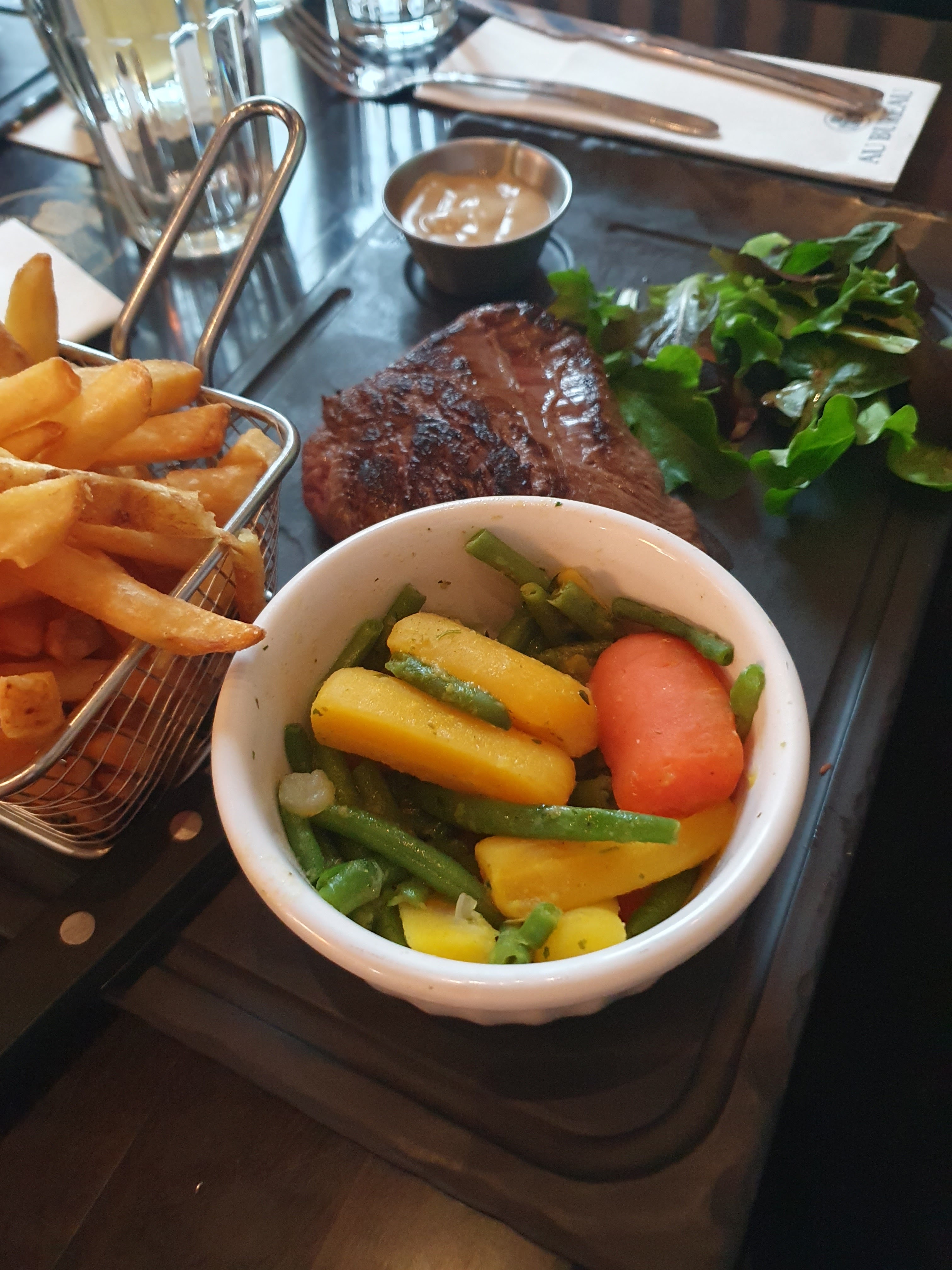 Resto d'une grande qualité esthétique, l'ambiance à l'intérieur comme à l'extérieur est appréciable, niveau sonore appréciable largement dépassé aux alentours de 20h (mais bon, c'est samedi). Niveau menu, j'ai pris une bavette d'excellente qualité, je mettrais un bémol sur la qualité des frites, très sèches et de la sauce d'accompagnement que j'ai trouvée insipide. Hormis ces deux détails, le service est d'une qualité exceptionnelle, efficace et très aimable et attentif. Le cadre est sympa dedans comme dehors, on appréciera la distance entre les tables pour plus d'intimité. Encore merci pour votre attention🙏