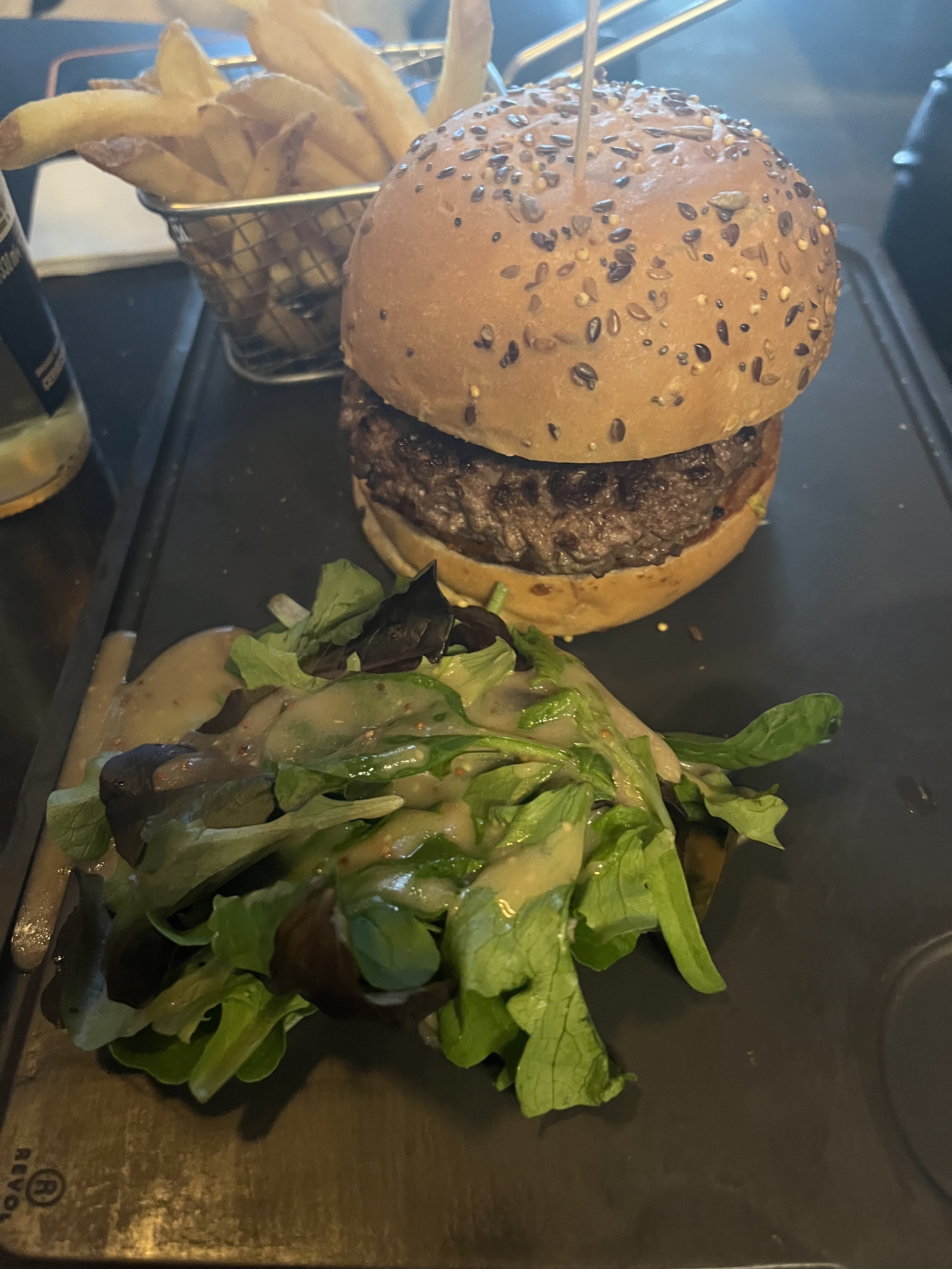 Un service midi sans avoir réservé, mais bien assez de place pour quatre, c'est immense 😜 Un peu trop même, hormis l'entrée, on se croirait dans un hangar bruyant et sombre, c'est dommage, ça gâche un peu l'expérience 😏 Un service efficace, avec le smile, c'est parfait ! 🤩 Des apéritifs très bons et généreux, du choix en boisson et en food 😁 Malgré la viande qui s'échappe de l'assiette, le plat est vraiment bon, tout comme le méga burger bien qu'il manque un peu de sauce ou fromage 😉 Plusieurs parfums manquants en glace, ceux qu'on choisit, forcément 😂 Et un thé rooibos gourmand, généreux et bien constitué 😁