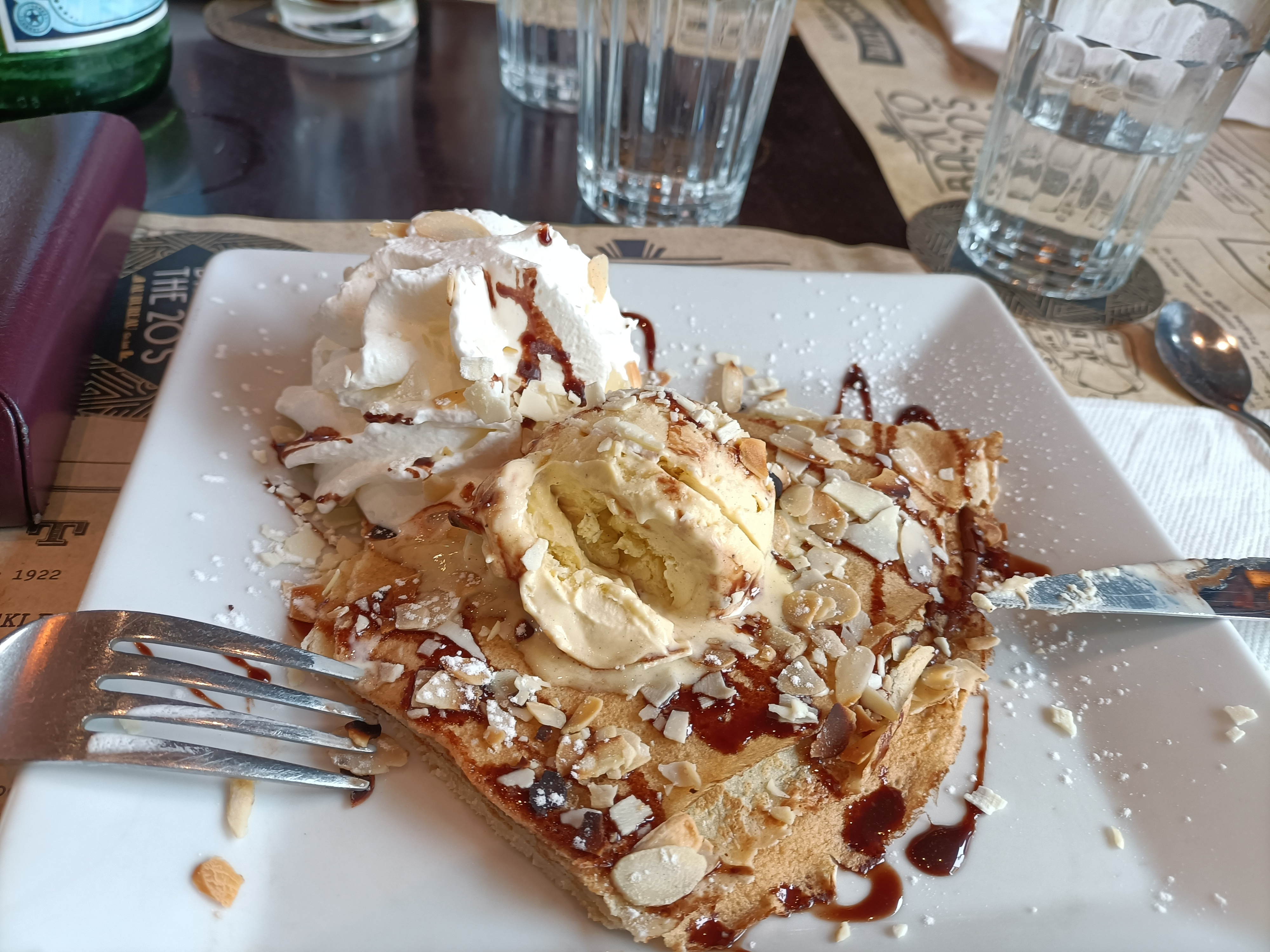 Petit bémol il n'y avait pas de Guinness ni une autre bière pression. Je me suis donc rabattu sur leur cocktail detox assez sympa je dois dire. Sinon je suis venu car ils diffusaient RB Leipzig/PSG ce soir là. J'ai essayé le Welch royal, ça se mange bien quand on ça faim.. Ça cale bien aussi. Du coup on a attendu la fin de la deuxième mi temps pour commander le dessert le temps de digérer un peu. Bon point pour la crème chantilly légère et onctueuse. Le coulis au fond m'a en revanche paru un peu lourd.